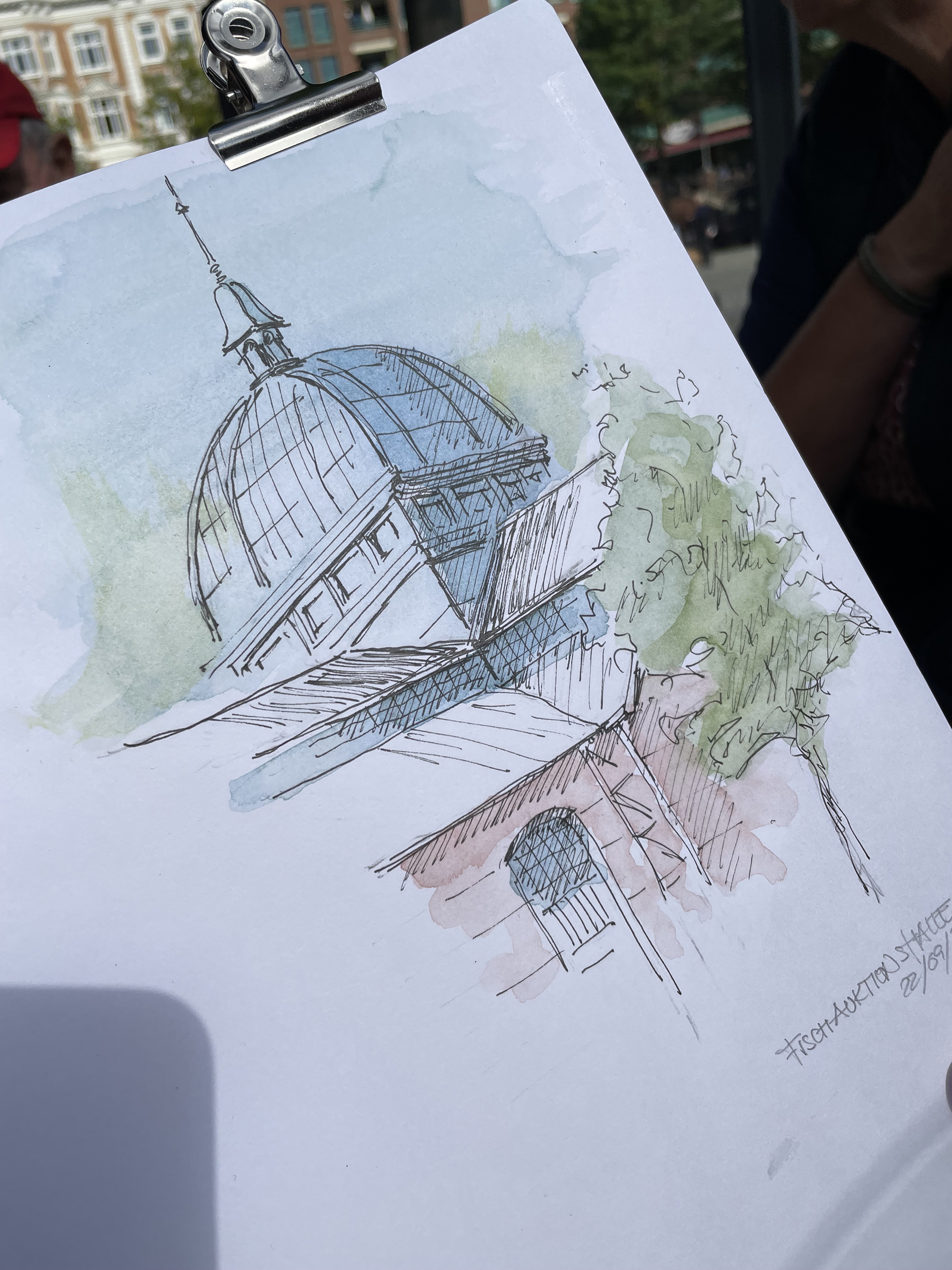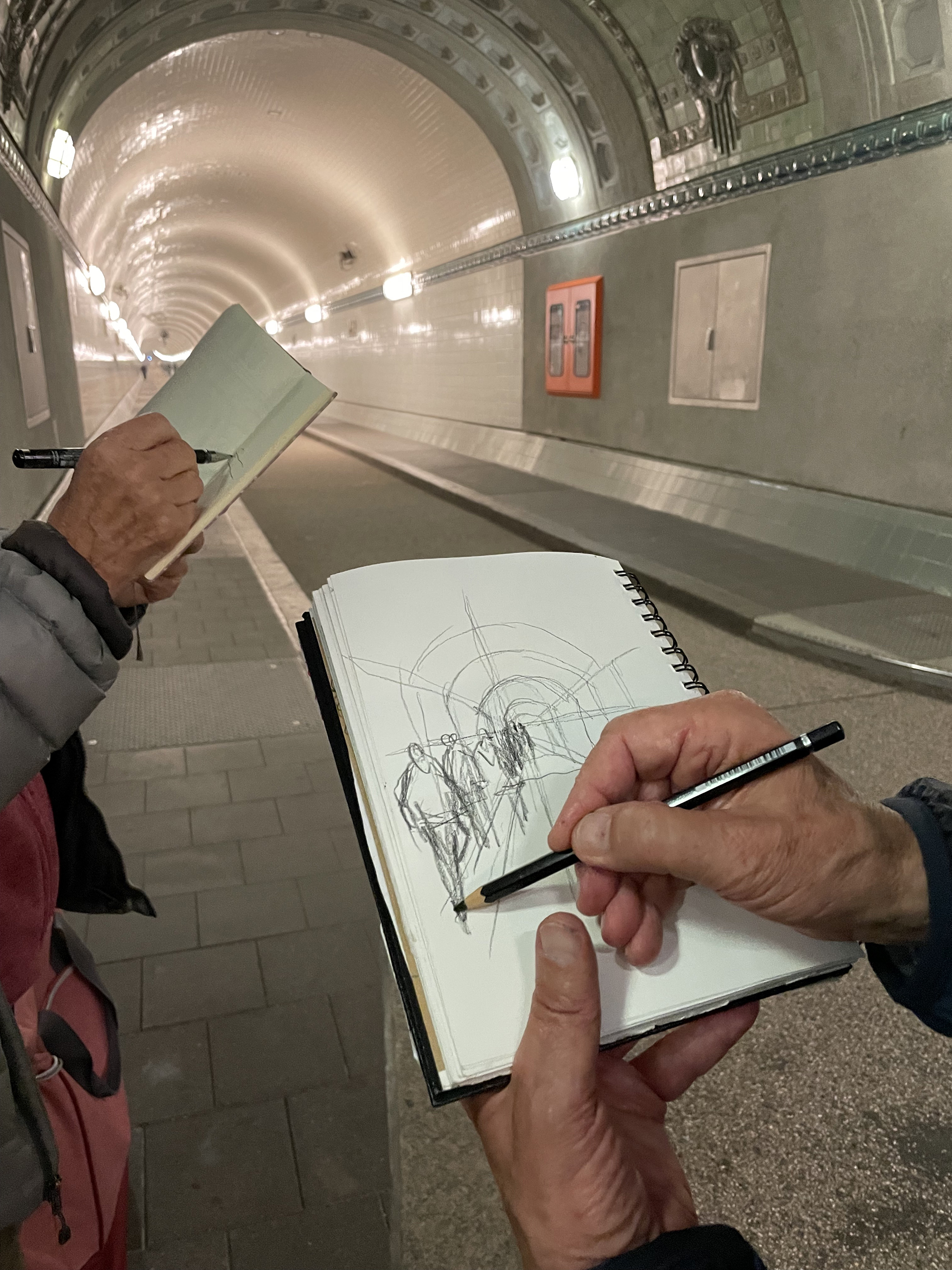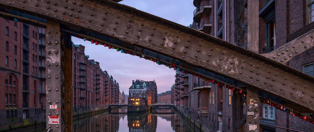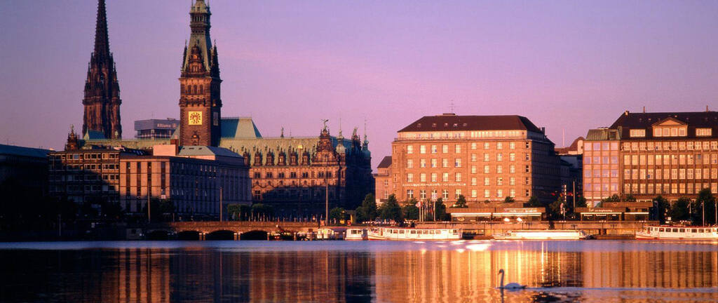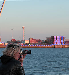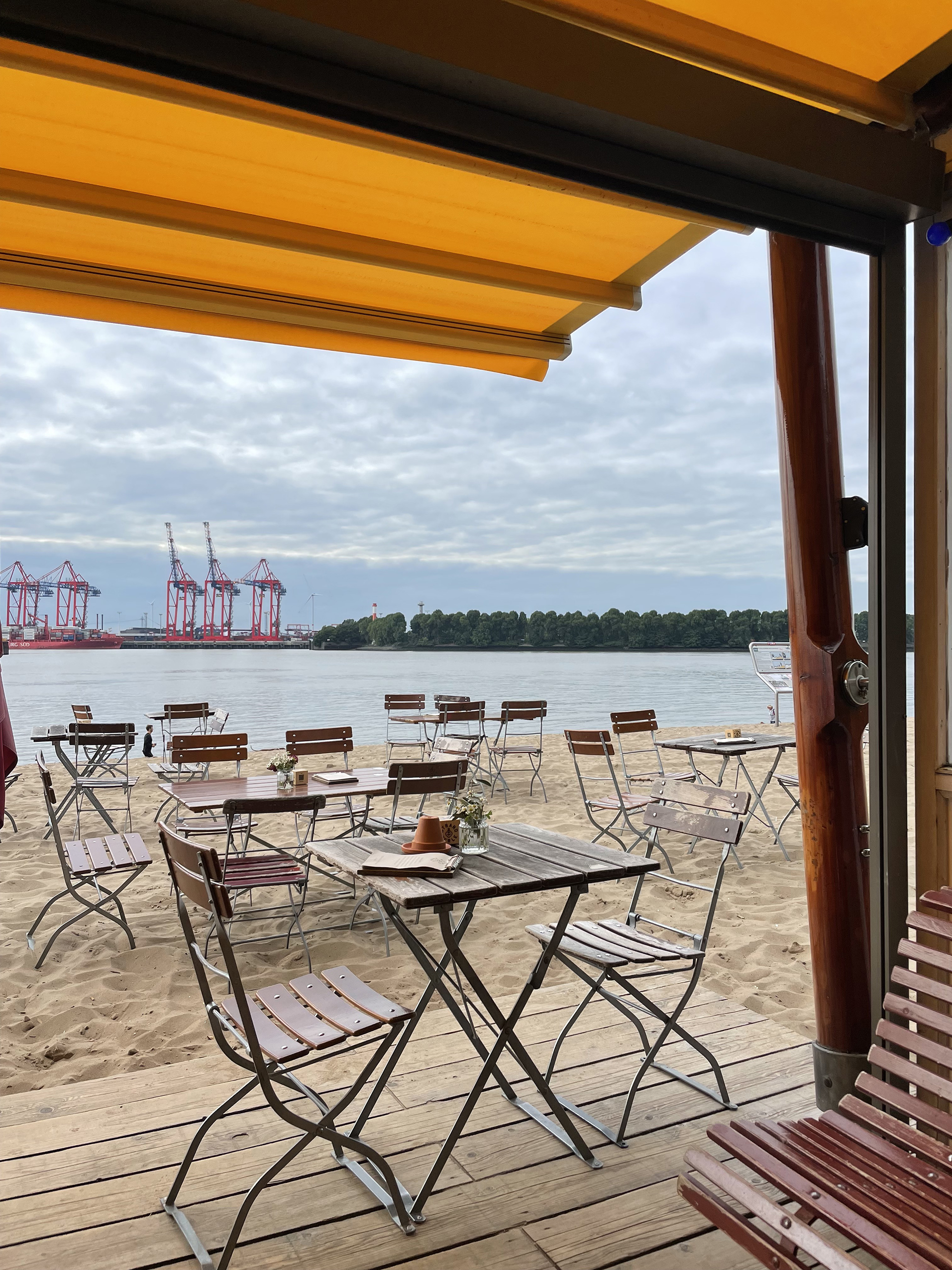 Leuchtturm mit Uhr an der Hamburger Hafenpromenade umgeben von Bäumen und Gebäuden bei bewölktem Himmel