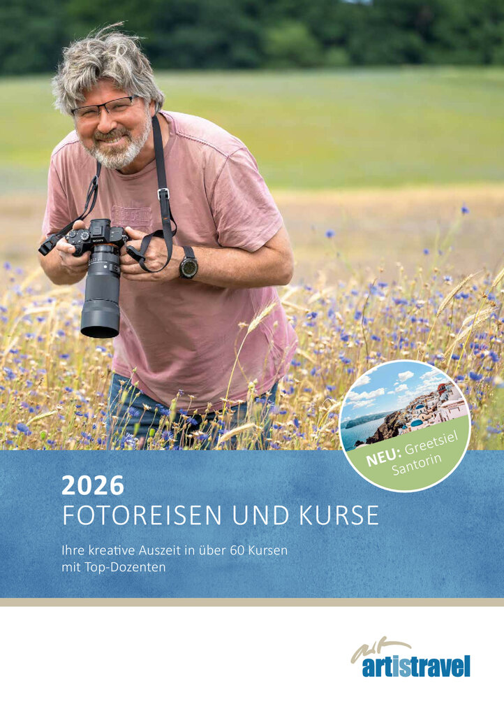 Ein herzliches Dankeschön Wir danken all denen, die uns bei unserem Programm tatkräftig unterstützten und artistravel möglich machen: • Unseren Kunden für Tipps und Anregungen und die Treue im letzten Jahr • Unseren Dozenten für ihren Rat und die Hilfe beim Zusammenstellen der Kursinhalte • All jenen, die 2025 für uns fotografiert haben. Besonders seien genannt: Freunde, Gäste, Dozenten und Teilnehmer. Fremdenverkehrs- ämter, Touristeninformationen und Hotels. Dank an Benedikt Ziegler für die fotografische Kursbegleitung Schreiben Sie uns oder rufen Sie an An welchen Orten, mit welchen Dozenten und zu welchen Themen würden Sie gern Ihre kreative Auszeit machen? Für Gruppen stellen wir sogar Wunschkurse zusammen. Auf Wiedersehen in der bunten und kreativen Welt von artistravel. Editor artistravel ist eine eingetragene Marke der art & friends GmbH & Co. KG Lothringer Straße 36 44805 Bochum Geschäftsführer: Sebastian Gruetz HRB 12443, HRA 6431 Konzept und Design art & friends GmbH & Co. KG Mediengestaltung, Bildbearbeitung und Reinzeichnung Krizia Di Dio, Dalya Yasin, Daniel Lauth, Tessa Shahrokhi, artistravel Druck LUC GmbH Bildnachweis Titel: Sänger Photography, Störer: unsplash by Aleksandar Pasaric, Vorblatt: Benedikt Ziegler, Kundenstimmen vorne: S.2-3 links: Karl-H. Warkentin, Oben & unten rechts, links: Benedikt Ziegler, mitte: Heinz Wohner, S. 4 oben rechts, mitte: Benedikt Ziegler, oben links: Martin Timm, unten links: Marion Hogl, S. 5 oben rechts, mitte, unten links: Benedikt Ziegler, oben links: Jürgen Wassmuth, unten rechts: Marion Hogl Editorial: Benedikt Zieg- ler, Themenüberblick: Grundlagen Bildgestaltung: Jutta Engelage, Natur: Michael Schultes, Architektur: Carola Schmitt, Abstrakte & Experimentelle Fotografie: Jürgen Wassmuth, Fotoreisen: S. 10, 11, 12 & 13: Benedikt Ziegler, Workshops: S. 14 & 15: Benedikt Ziegler, Smartphone-Fotografie: S. 16: unsplash by shakib uzzaman, S. 17: Björn Göttlicher, Unsere Dozenten: S. 18-19: Benedikt Ziegler, Unsere Reisziele - Deutschland: Heinz Wohner, Amrum: S. 82: Mark Robertz, S. 83: Helmut Kruse, Bamberg: S. 84: Björn Göttlicher, Fassade: Unsplash by Markus Spiske, S. 85: Adobe Stock by elxeneiz, Bayerisches Voralpenland: S.86: Heinz Wohner, Berchtesgadener Land: S.88 Watzmann: (c) elxeneize- Adobe Stock, S. 89, unten: Adobe Stock by Pawl Pajor, Berlin: S.90: Shutterstock by canadastock,Bodensee: S.92-93 oben: Maximilian Mann, Borkum: S. 94-95 oben: Adobe Stock by Haiderose, unten: Alamy by Thomas Imo, Greetsiel: S. 96: Adobestock by Dar1930, S. 97: Thomas Bichler, Hamburg: S.98: iStock by Christian Spahrbier, S.99: iStock by alxpn, Hattingen: S.100: Sebastian Grütz, S. 101: Heinz Wohner, S. 89: Alexandra Gerlach, Karwendelregion: S. 102 oben: Heinz Wohner, unten: Wolfgang Veeser, Pfalz: S.104 oben: CC-BY-SA Pfalz Touristik, Dominik Ketz, Prerow: S.106 oben: Heinz Wohner, Urwald: Adobe Stock by sg-naturephoto.com, Rügen: S.108-109 oben: Shutterstock by canadastock, unten: Marion Hogl, Sächsische Schweiz: S.110 oben: Sandro Fabris, Spiekeroog: S.112: Nishta Katrin Trutschler-Ebert, S. 113 Natur: Tom Rinck, Inselcafé: Nordseebad Spiekeroog GmbH, Sylt S. 114: Marion Hogl, S. 115: Benedikt Ziegler, Worpswede S. 116-117: Benedikt Ziegler, Unsere Reiseziele (Europa): Mark Robertz, Italien S. 120-121: Bernd Meissner, Italien S. 122-123 oben links: Adobe Stock by Ivan Kmit, Montescudaio: Shutterstock by robertonencini, Österreich: Carolina Frank, S.124 links: Jürgen Wassmuth, Unten: Thomas Bichler, Tschechien: iStock by Agnieszka Gaul, Rathausuhr: Adobe Stock by Jenifoto, Unser Kursprogramm: Benedikt Ziegler, S. 140-141: Benedikt Ziegler, Kundenstimmen hinten: S.142: Helmut Kruse, 143: oben links, mitte links, Benedikt Ziegler, oben recht: Mark Robertz, mitte recht: Holger Michlenz, unten rechts: Anja Artzt, S. 143 Closer: Benedikt Ziegler Für alle nicht genannten Fotografien liegen die Rechte entweder bei den Dozenten (Dozentenseiten), bei Hotels und Fremdenverkehrsämtern (Ortsseiten) oder bei artistravel. Alle anderen Fotos by artistravel / Benedikt Ziegler