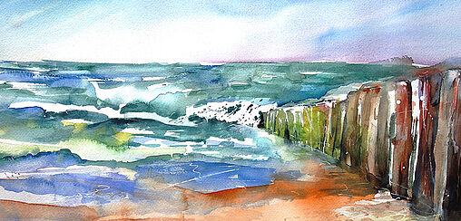Backsteinhaus am Wasser mit Bäumen und grünem Ufer im Wattenmeer bei Sonnenlicht