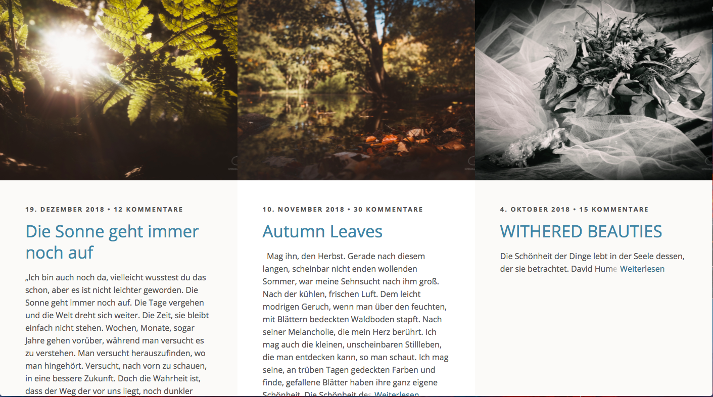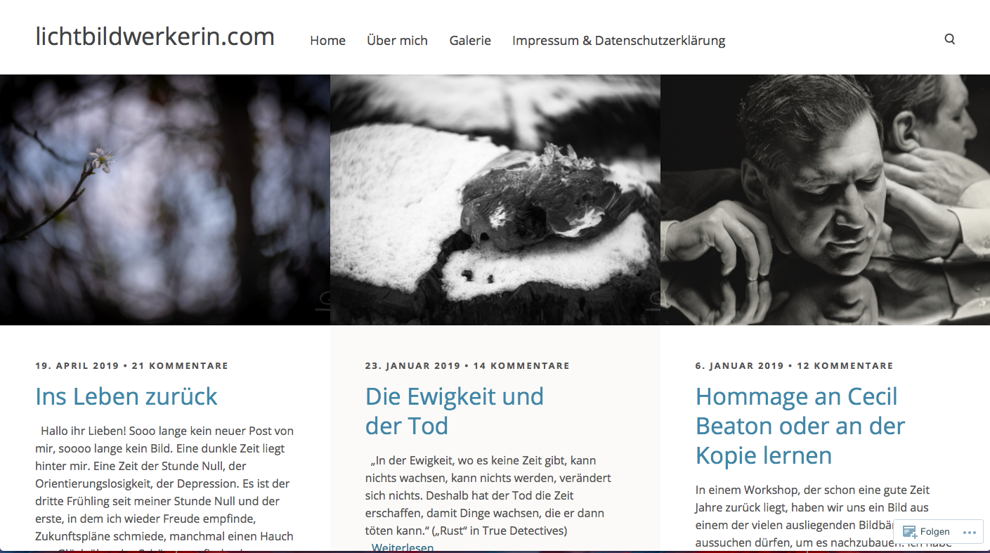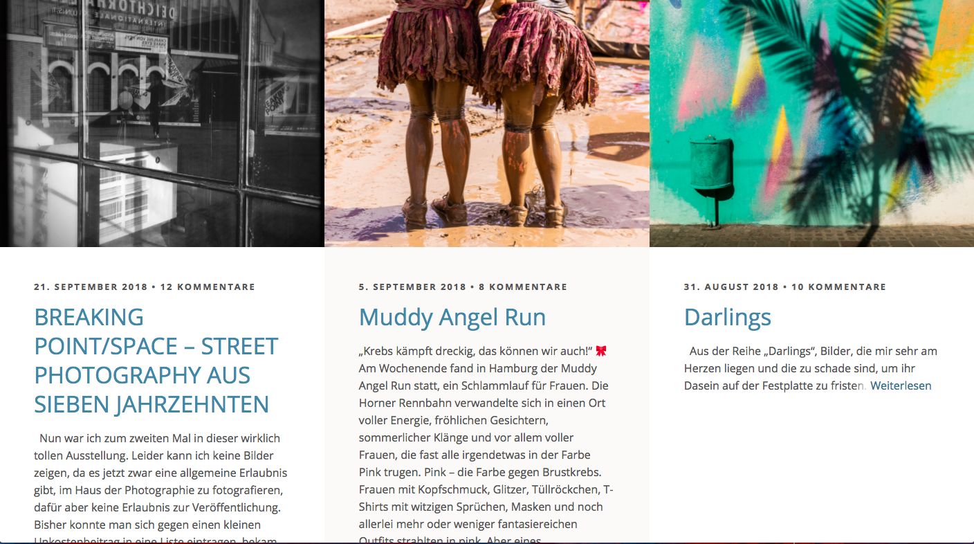 Der Charme dieses Blogs liegt in seiner Perspektive. Conny Hilkers Beiträge erzählen in direkter Art und Weise von ihrer ganz persönlichen Sicht auf die Dinge und die Fotografie. Neben Posts eigener Werke (gern ergänzt durch poetische Bildunterschriften) reihen sich Berichte über Ausstellungen und Events, Shooting-Geschichten und persönliche Gedanken. Gern auch mal melancholisch. Bei der „perfekten Welt“ der sozialen Medien macht Conny Hilkers nicht mit – sehr erfrischend!