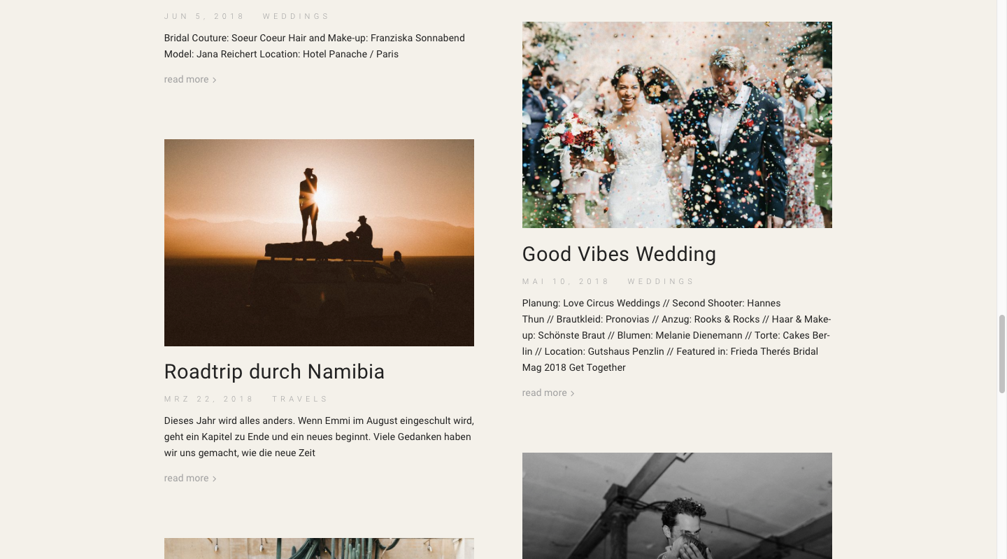 Der Blog von Fotografin Nancy Ebert enthält vor allem Hochzeits- und Reisefotografien, zwischendurch gibt es aber auch mal Ausreißer wie zum Beispiel „Kids Fashion Editorial“. Gemein haben alle ihre Beiträge die Komposition aus sehr viel Foto und sehr wenig Text. Praktische Tipps und persönliche Anekdoten sucht man hier also lange, aber ihre umwerfenden Fotografien erzählen die Geschichten selbst, sind unglaublich inspirierend und machen Lust auf’s Fotografieren.