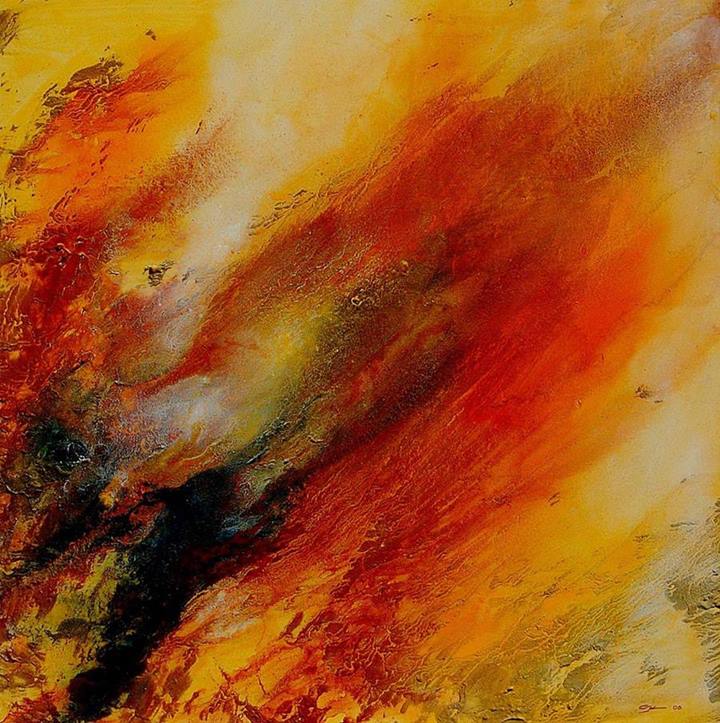 Zum Malen einer abstrakten Landschaft suchen Sie sich zuerst frei eine Farbe ihrer Wahl aus, z.B. Rot. Damit das Rot auf der Leinwand stark und kräftig wirkt, beginnen Sie mit den Farben Gelb und Weiß für den Hintergrund und tragen diese flächig auf. Um einen gleichmäßigen Verlauf zwischen den Farbtönen zu erzeugen, mischen Sie in das Gelb immer mehr Orange und Rot dazu. Damit der Verlauf keine störenden Konturen bekommt, sollten die Farbtöne immer wieder mit etwas Weiß aufgehellt werden. Im Vordergrund des Bildes tragen Sie die Farben ebenso flächig auf wie im Hintergrund. Hier malen Sie vor allem mit kräftigen Rottönen, damit eine Ebene zwischen Hintergrund Vordergrund entsteht.