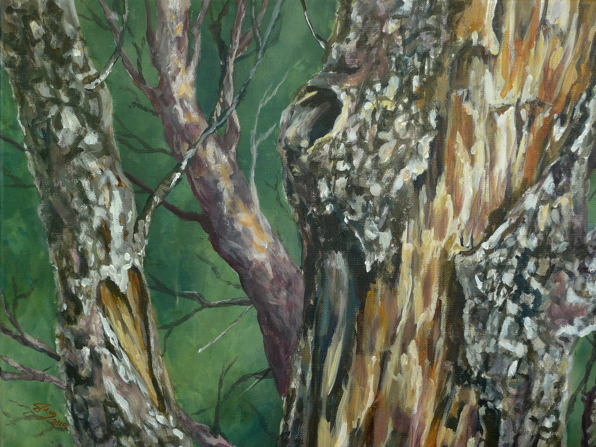 „Wenn Ihr einen Baumstamm oder Äste malt, vergesst nicht, dass ihre Formen wie Zylinder röhrenförmig sind. Stellt also sicher, dass Ihr zuerst Schatten und Licht an der richtigen Stelle entsprechend der Biegung der Zweige korrekt malt. Und erst danach fügt Ihr die Details der Rinde und der Holzstruktur hinzu.
