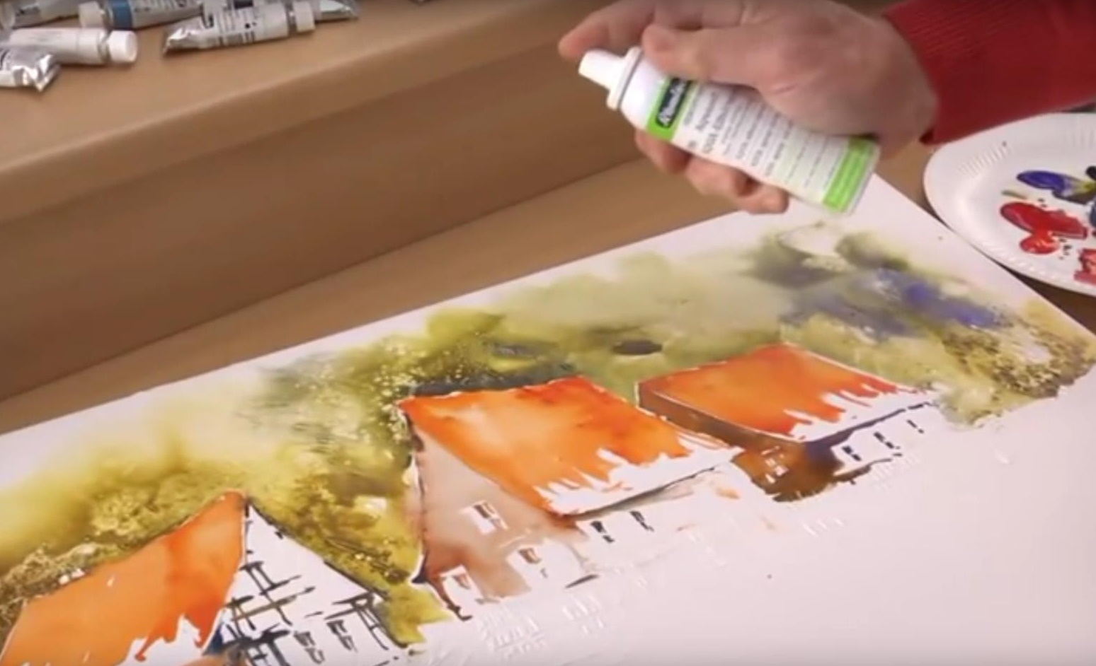 Die Verwendung von Effektspray in der Aquarellmalerei ist für jeden eine schöne Sache. Besonders wenn es um die Blattstrukturen von Büschen und Bäumen geht, erleichtert der Einsatz von Effektspray die Darstellung. Insbesondere eher langweilig scheinende Flächen können so blitzschnell aufgewertet werden.