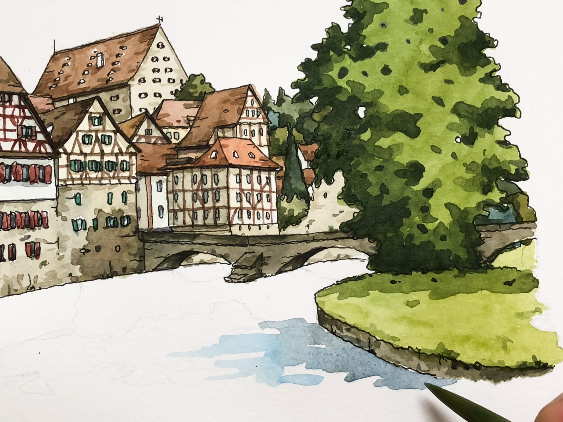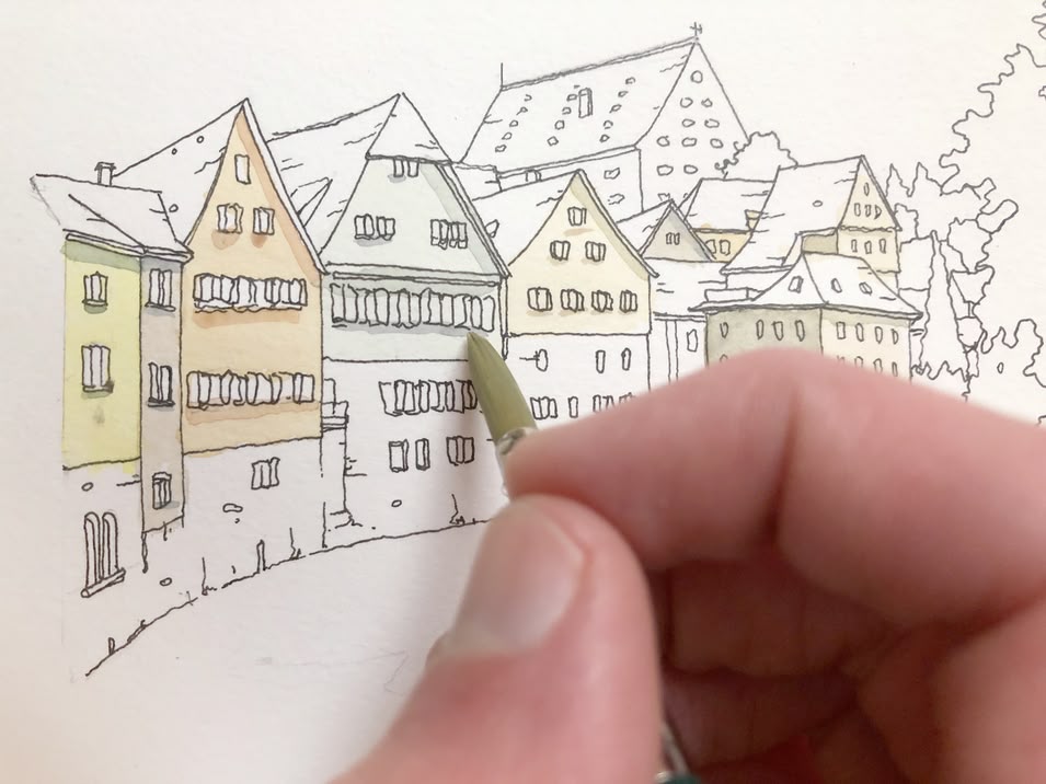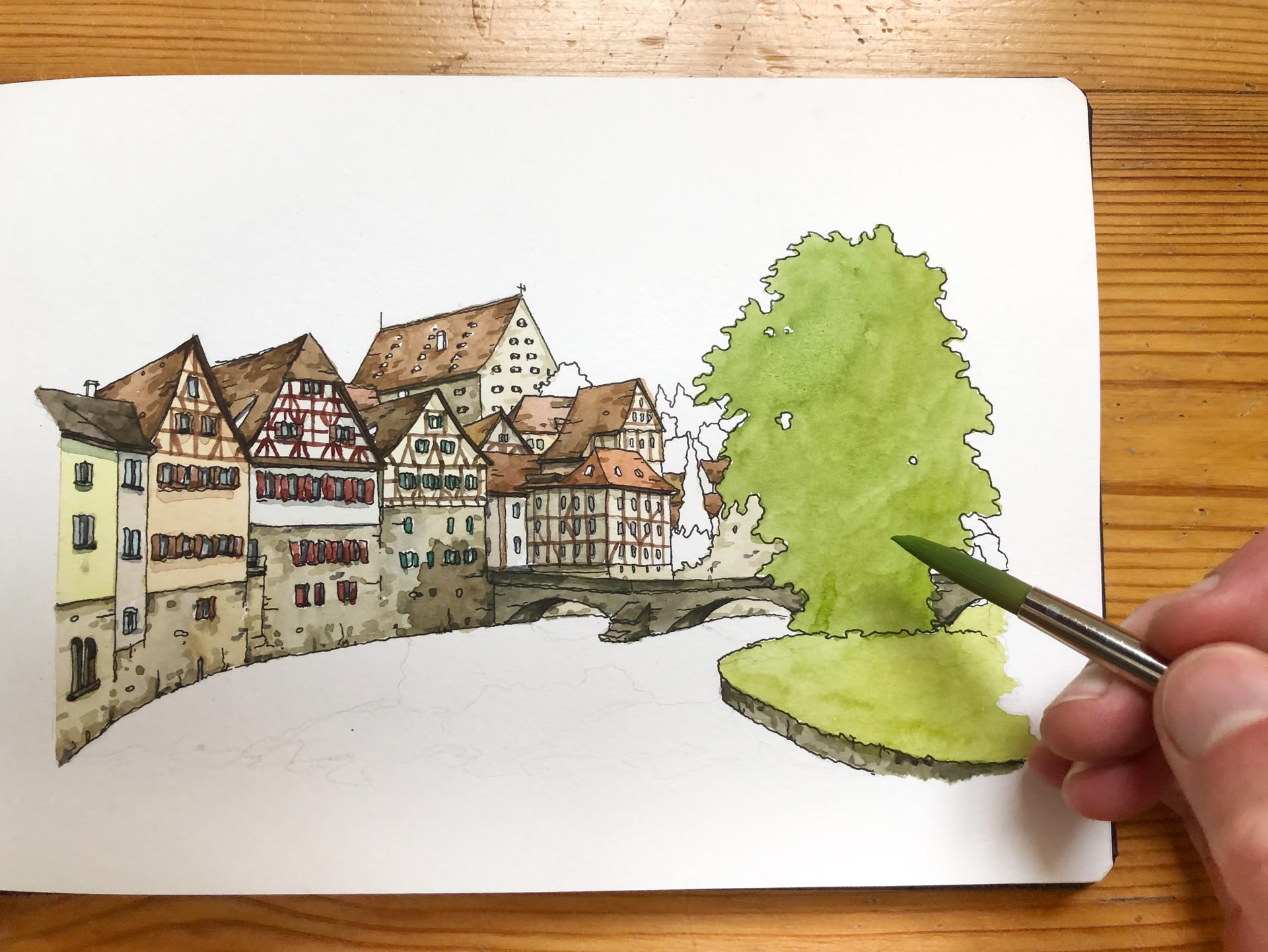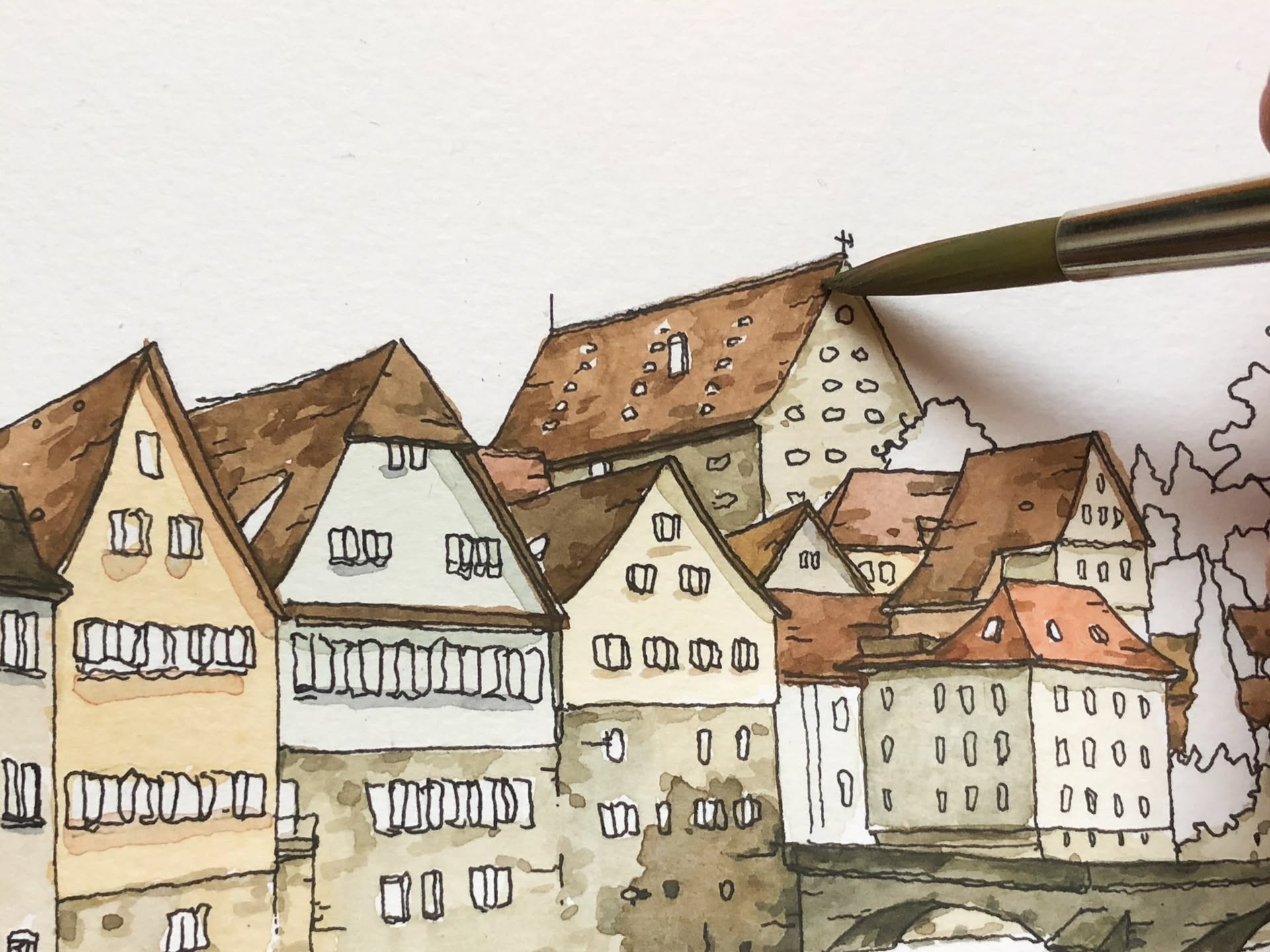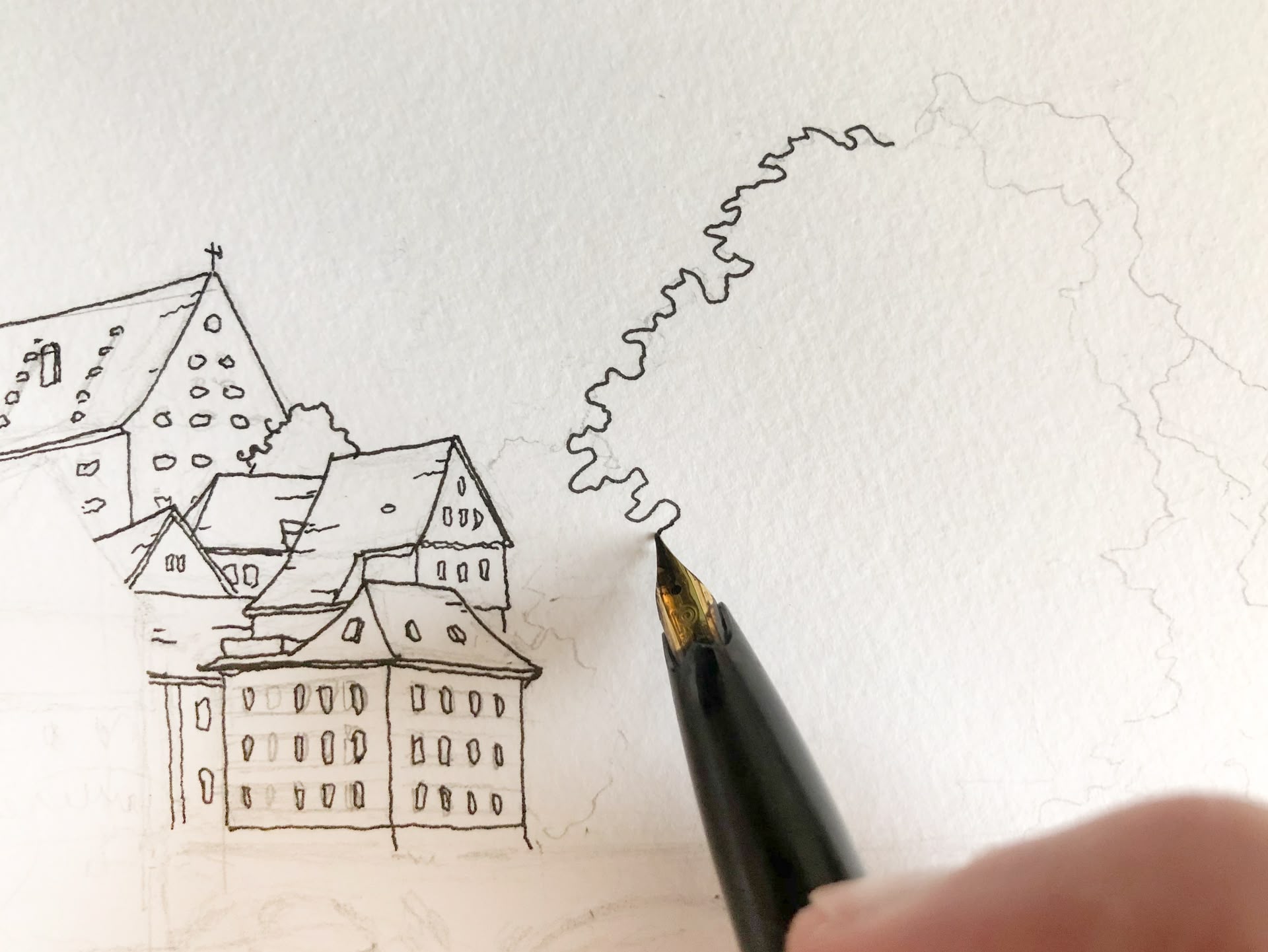 Nun fangt Ihr an, die definierteren Linien zu zeichnen. Danny verwendet dazu einen Füller und wasserfeste Tinte. Zeichnet zuerst die Umrisse der Gebäude und deutet dann mit kleinen Strichen die Texturen an der steinernen Mauer und am Dach an. Wenn Ihr möchtet, könnt Ihr mit Bleistift noch ein paar Hilfslinien an den Fensterreihen zeichnen. Bei den Pflanzen und Bäumen im Bild zeichnet Danny nur die Umrisse und verwendet die Aquarellfarben erst, wenn er Kontraste erzeugen möchte.