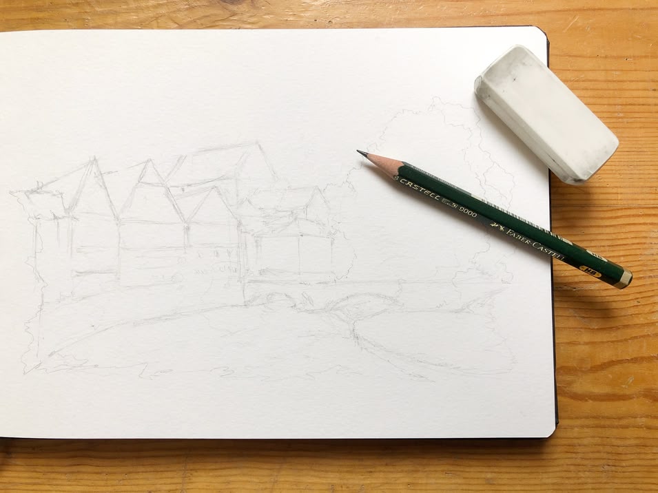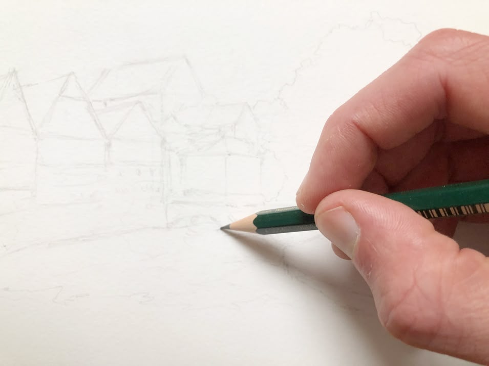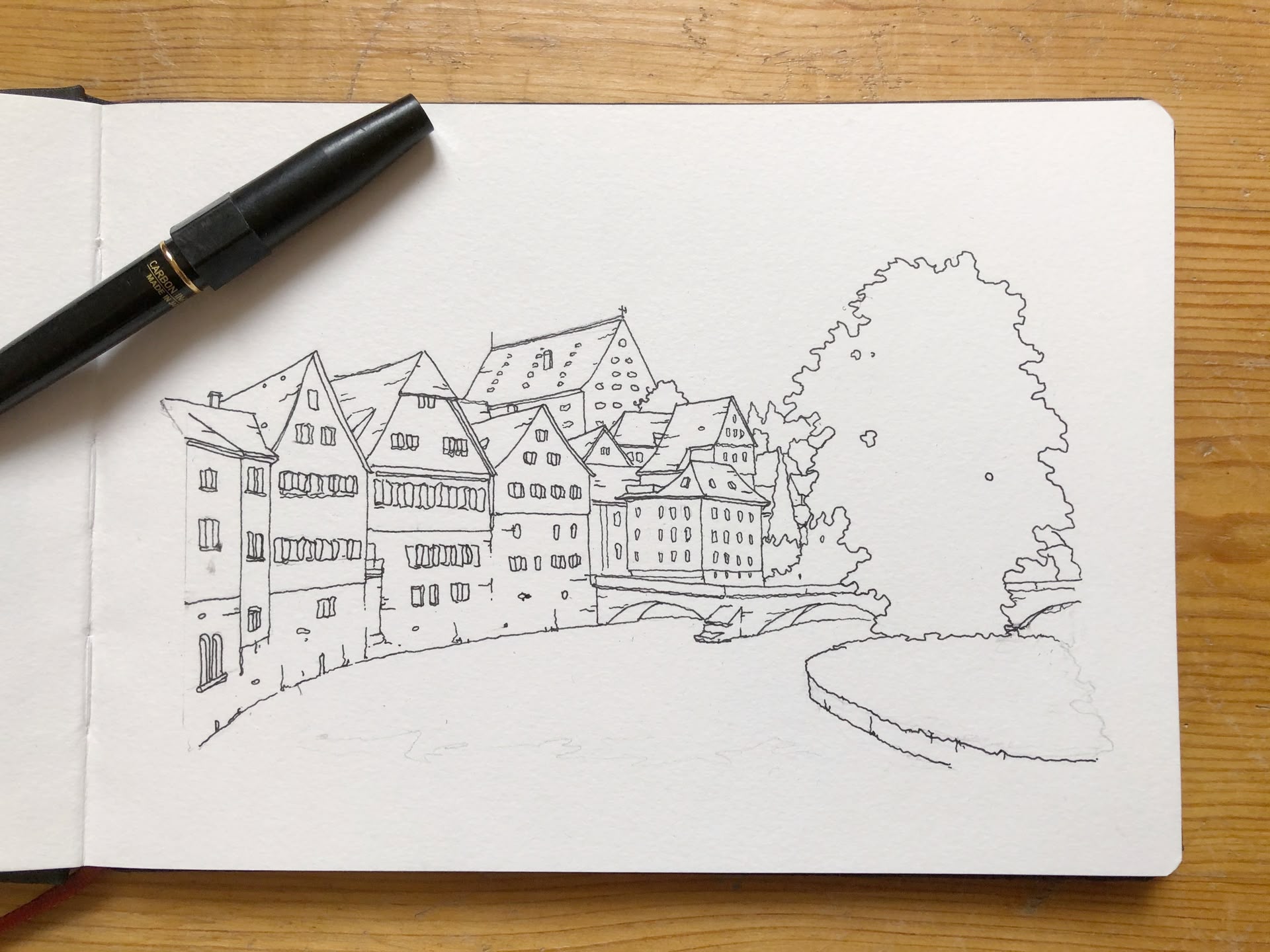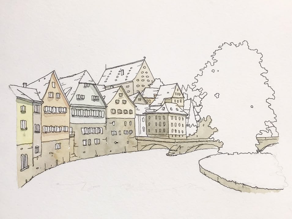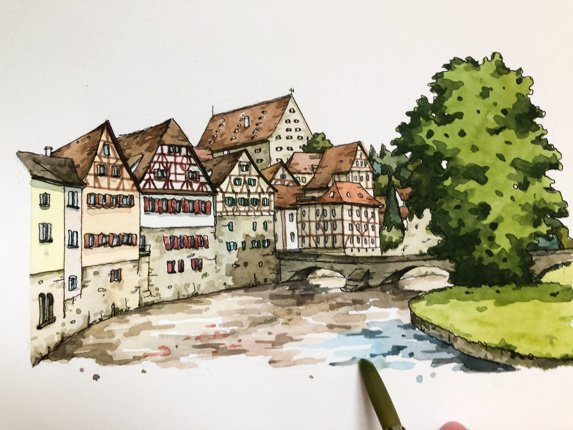 Nun fangt Ihr an, die definierteren Linien zu zeichnen. Danny verwendet dazu einen Füller und wasserfeste Tinte. Zeichnet zuerst die Umrisse der Gebäude und deutet dann mit kleinen Strichen die Texturen an der steinernen Mauer und am Dach an. Wenn Ihr möchtet, könnt Ihr mit Bleistift noch ein paar Hilfslinien an den Fensterreihen zeichnen. Bei den Pflanzen und Bäumen im Bild zeichnet Danny nur die Umrisse und verwendet die Aquarellfarben erst, wenn er Kontraste erzeugen möchte.