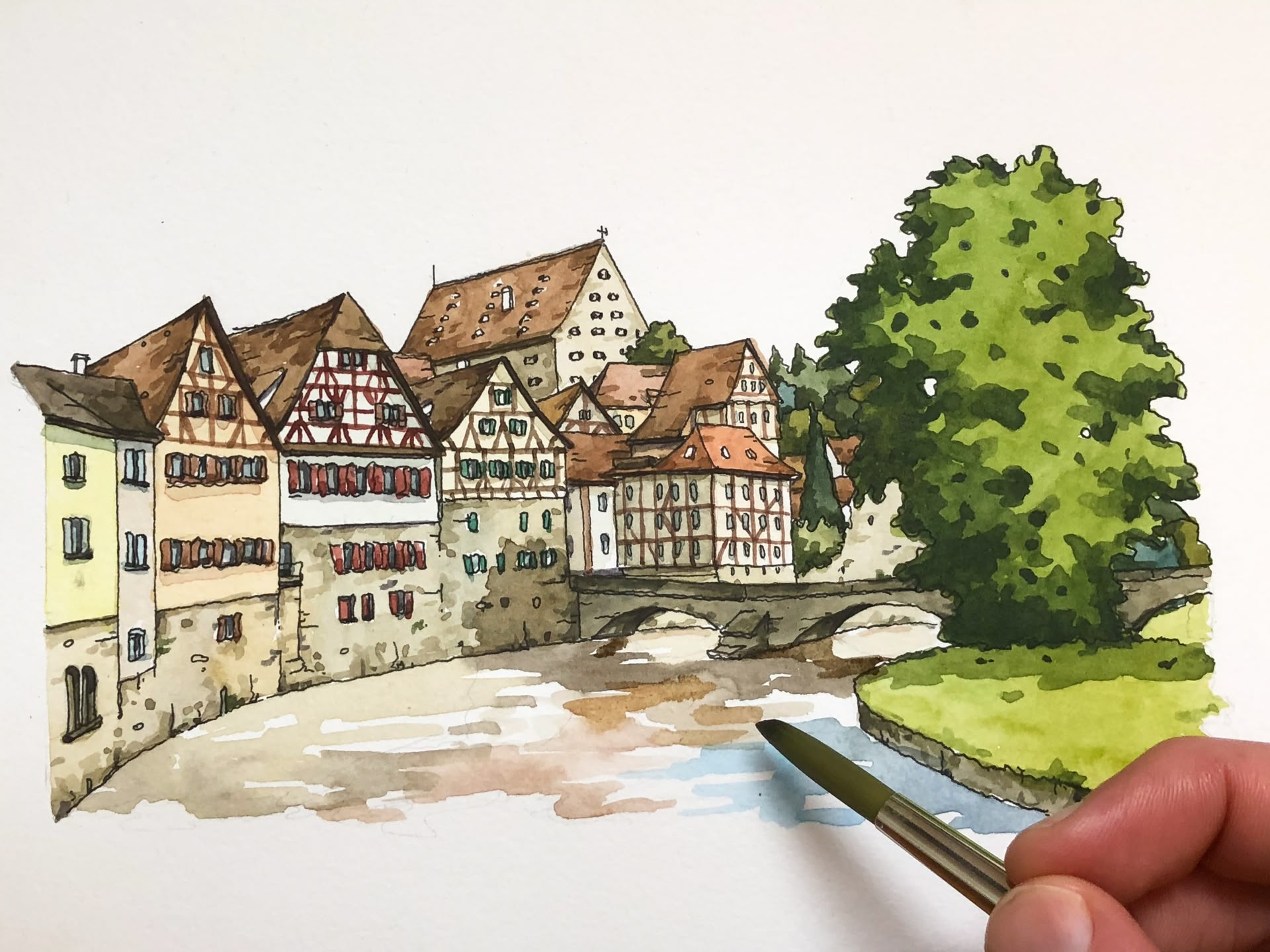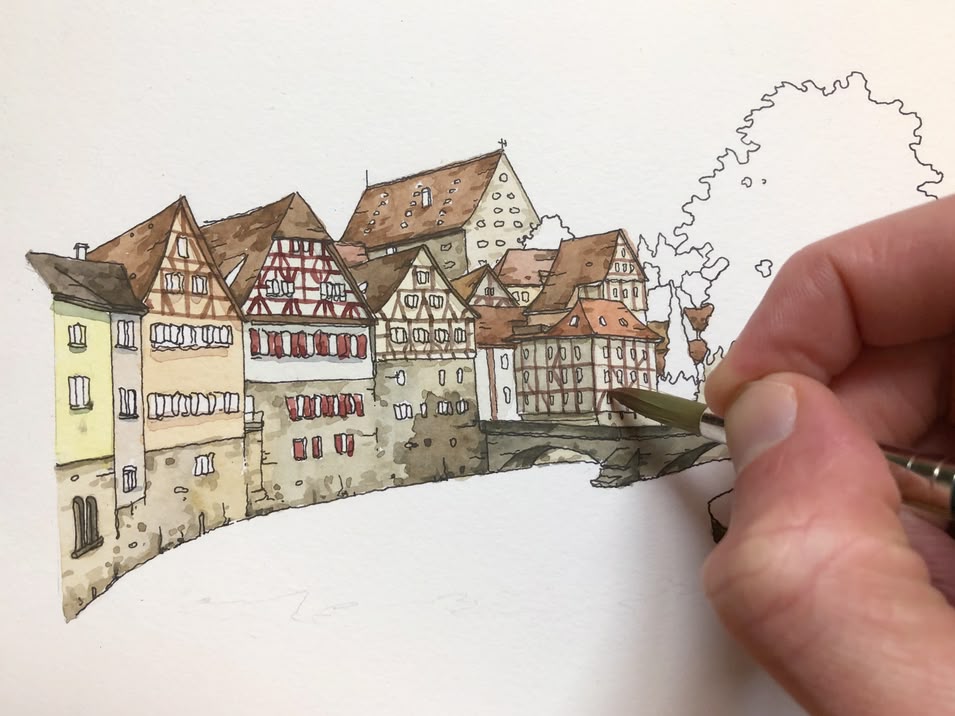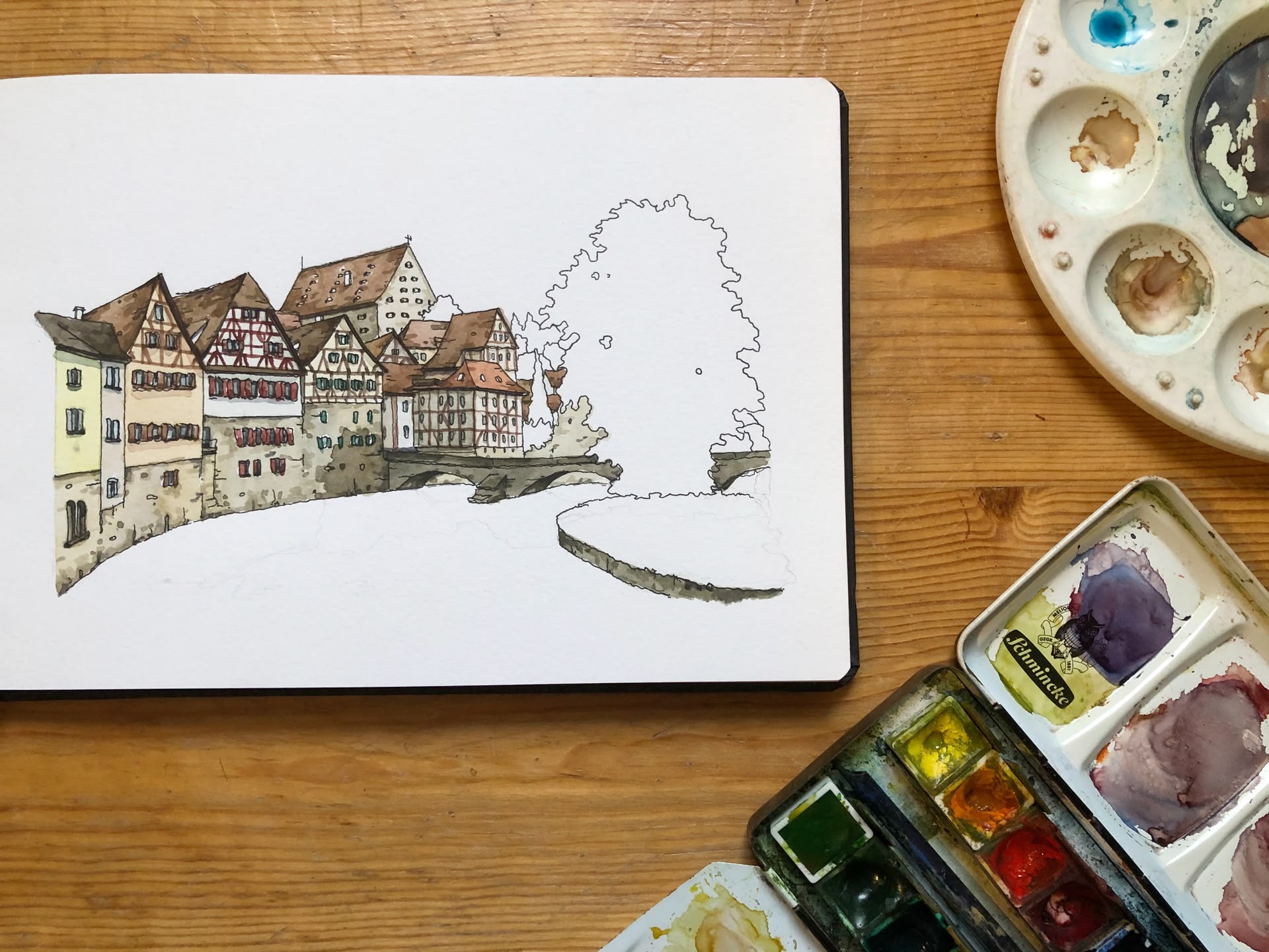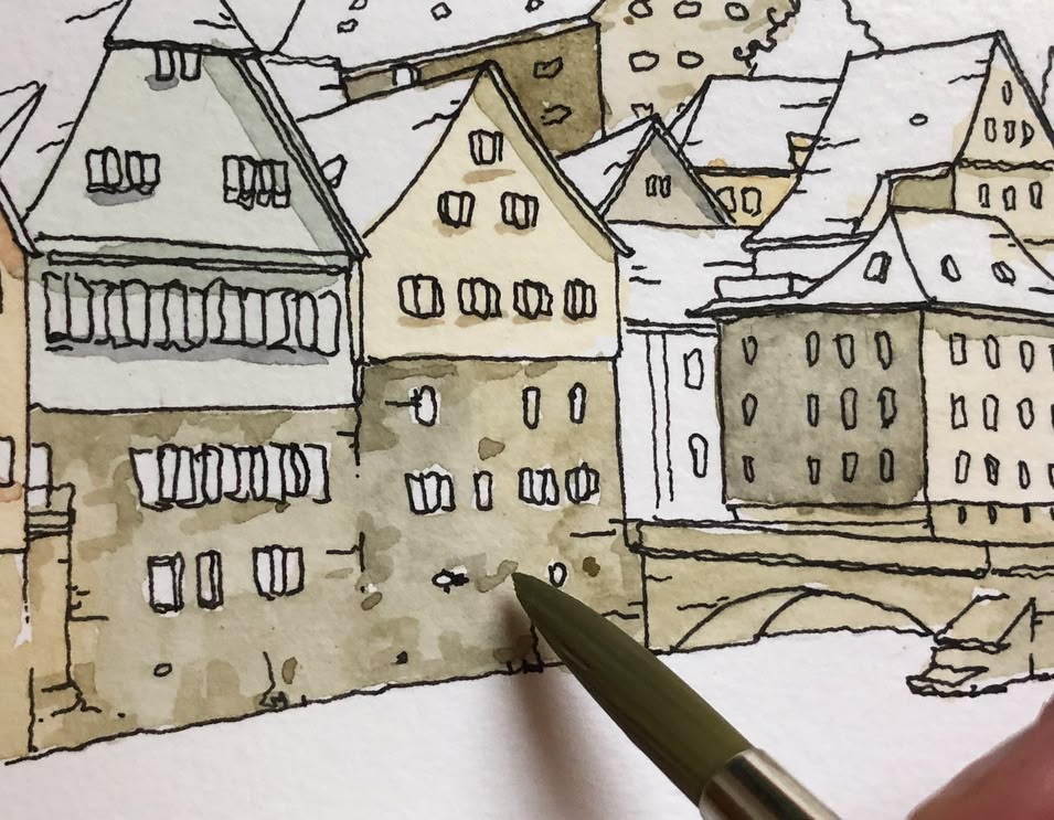 Urban Sketcher und artistravel Dozent Danny Hawk zeigt Euch in diesem Artikel, wie Ihr eine komplexe Altstadt-Szene mit Fachwerkhäusern vereinfacht mit Aquarell und Tinte malen könnt. Grobe Formen helfen Euch, die einzelnen Gebäude zu reduzieren. Die Aquarellfarben tragt Ihr in Schichten auf und durch den Negativraum entsteht ein deutlicher Fokus im Bild.