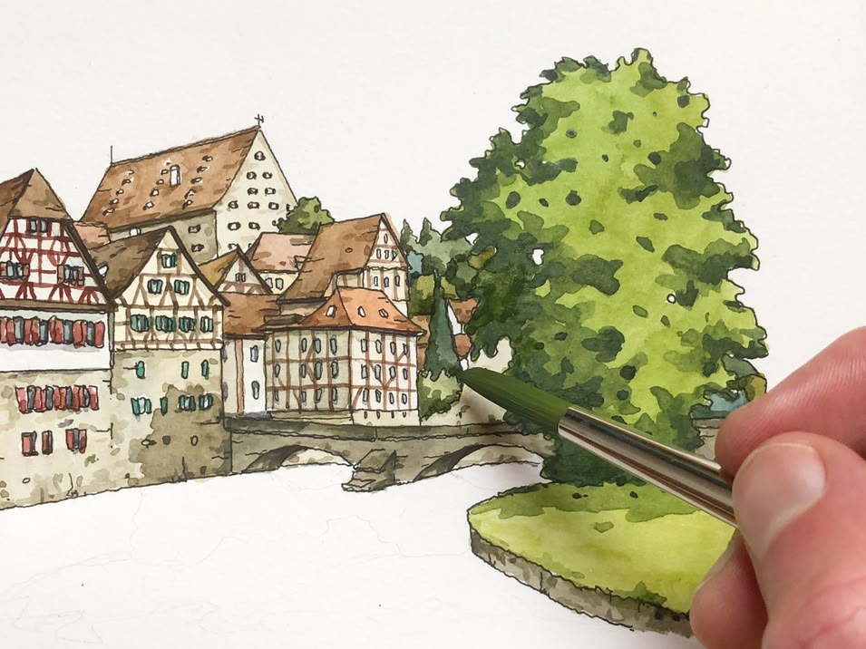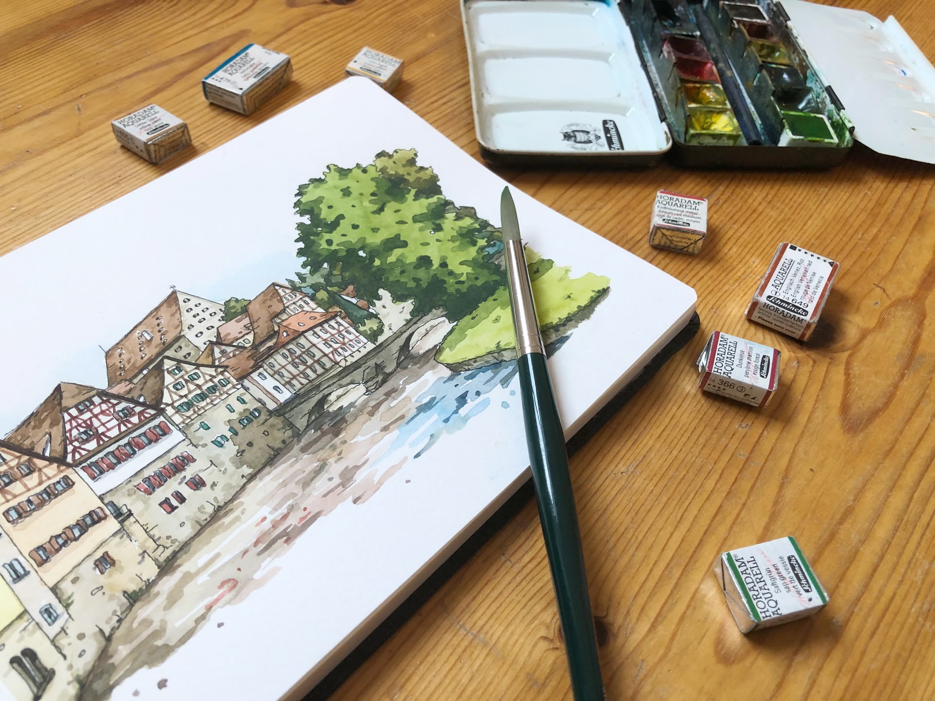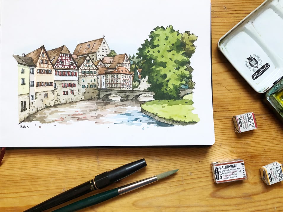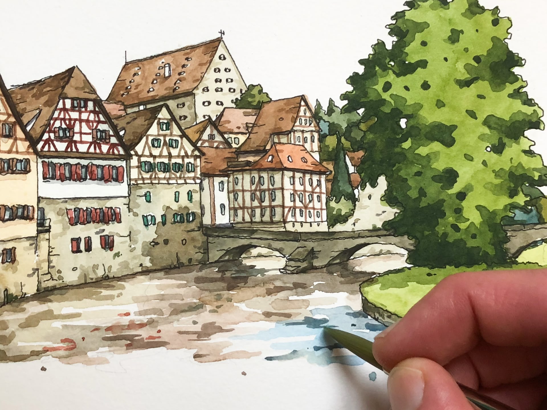 Urban Sketcher und artistravel Dozent Danny Hawk zeigt Euch in diesem Artikel, wie Ihr eine komplexe Altstadt-Szene mit Fachwerkhäusern vereinfacht mit Aquarell und Tinte malen könnt. Grobe Formen helfen Euch, die einzelnen Gebäude zu reduzieren. Die Aquarellfarben tragt Ihr in Schichten auf und durch den Negativraum entsteht ein deutlicher Fokus im Bild.