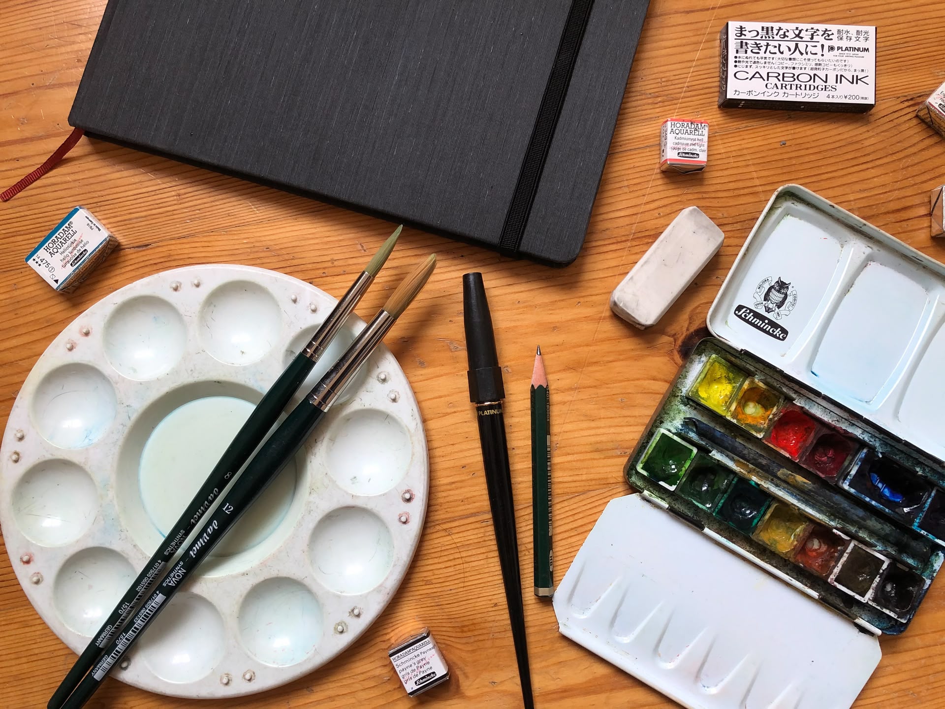 - Stifte: Bleistift für die Vorzeichnung, dann Fineliner oder Füller mit wasserfester Tinte für die Zeichnung. Empfehlenswert sind der Lamy-Safari mit De Atramentis Dokumententinte (Konverter notwendig) oder der Platinum Carbon Desk Pen mit Platinum Carbon Ink-Tintenpatronen