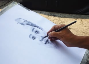 • Foto von einem gezeichneten Portrait und einer Hand, die einen Bleistift darüber hält