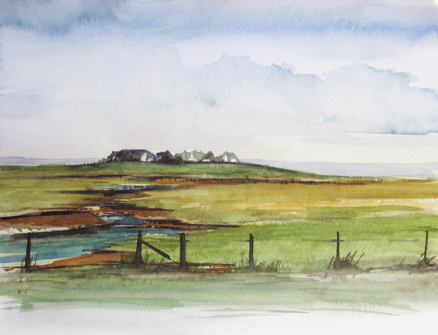 Beim Aquarellieren des Himmels ist es hilfreich die Farbe am oberen Bildrand am dunkelsten aufzutragen und sie dann zum Horizont hin immer weiter zu verdünnen. Somit hebt sich der Himmel deutlich von der meist dunkleren Landschaft ab. Um den Himmel kontrastreicher wirken zu lassen können Sie nach dem Trocknen der ersten Schicht eine zweite darüber legen, bei der Sie einige zuvor bemalte Flächen einfach auslassen.