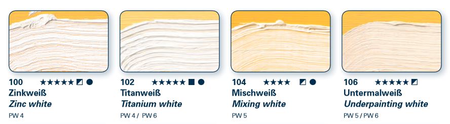 Neben den halbdeckenden Farbtönen „Zinkweiß“ und „Mischweiß“, die sich super zur farblichen Aufhellung bunter Farbtöne eignen, gibt es noch das „Titanweiß“. Wie der Name schon vermuten lässt, handelt es sich hierbei um ein absolut hochdeckendes, strahlendes und reines Weiß. Aufgrund der starken Deckkraft, sollte man dieses Weiß eher fürs Mischen von Pastelltönen verwenden, da der Farbtoncharakter von bunten Farben hiermit schneller verloren geht. Als letztes gibt es noch das halbdeckende, Leinöl-haltige „Untermalweiß“, das sehr schnell trocknet. Es wird, wie der Name schon sagt, meist zur Untermalung verwendet. Hierbei minimiert es die Rissbildung bei den Buntfarben, die man über das weiß legt. Zum Mischen oder zur reinen Verwendung eignet sich dieser Weißton eher weniger, da er aufgrund des Leinölanteils zur Gilbung neigt. (Schmincke)