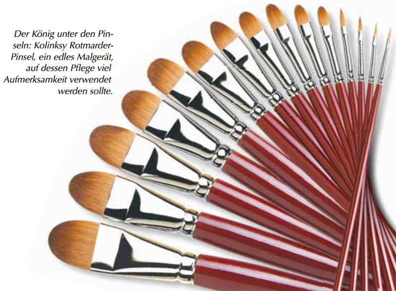 Für die Aquarellmalerei verwendet man Pinsel mit weichem Haarkörper natürlichen oder synthetischen Ursprungs. Zu diesen Pinseln zählen Rotmarder-, Rindsohr- und Fehhaarpinsel. Der Haarkörper von hochwertigen Naturhaarpinseln nimmt viel Feuchtigkeit auf, hat eine große Spannkraft und behält immer seine Spitze. Wie bei der Ölmalerei zählen RotmarderPinsel, wie der Maestro Tobolsky-Kolinsky Rotmarder- und der Kolinsky-Rotmarder, zu den hochwertigsten Exemplaren mit kräftiger Spitze und üppigem Haarkörper.