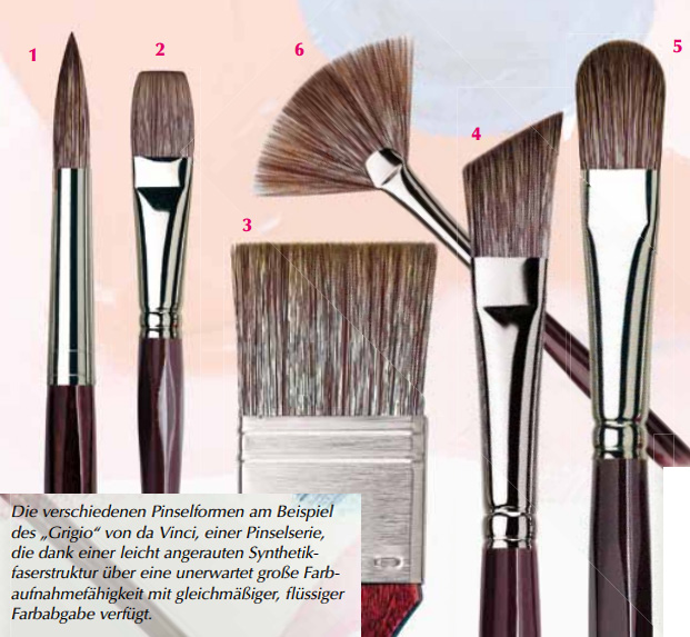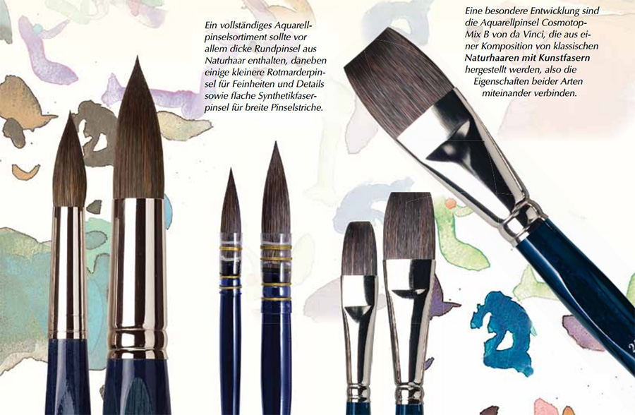 Die meist ziemlich harten Borstpinsel sind für die Aquarellmalerei nicht geeignet. Qualitativ hochwertig und preislich erschwinglich sind die beliebten Aquarellpinsel Nova-Synthetics von da Vinci, die aus reinen Fasermischungen unterschiedlicher Stärken und Längen bestehen. Extra feine, geschmeidige Synthetikfasermischungen bietet der Spin-Synthetiks Cosmotop-Spin von da Vinci, auch für die Seidenmalerei einsetzbar.