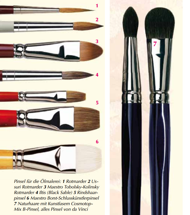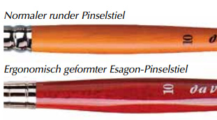Der Top-Acryl-Pinsel von da Vinci (siehe Abb.) ist ein hochwertiger echter Allrounder, aus außerordentlich beanspruchbaren, rotbraunen Synthetikfasern und speziell für das Malen mit pastosen Farben gefertigt. Die Top-Acryl-Pinsel sind auf Schluss präpariert. Der lange anthrazitfarbene Esagonalstiele des Pinsels liegt leicht in der Hand und der Pinsel läßt sich bequem führen.