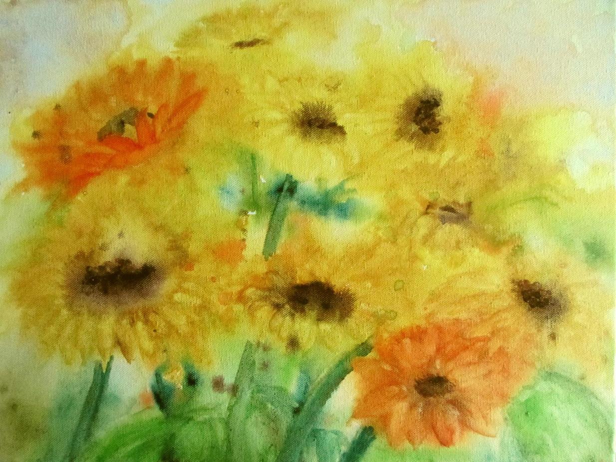 Vielleicht haben Sie noch einen Keilrahmen übrig und Lust zum Experimentieren? Dann malen Sie doch mal statt mit Öl oder Acryl einfach mit Aquarellfarbe! Beim Aquarellieren auf Keilrahmen ohne Aquarellgrundierung kann man die Farbe noch lange „verschieben“ – diese Eigenschaft habe ich bei dem Bild „Sonnenblumen auf Keilrahmen“ genutzt, um mit Hilfe eines relativ trockenen Pinsels einzelne Blütenblätter zu formen. Damit die Aquarellfarbe nicht zu stark von der Grundierung des Keilrahmens abperlt, hatte ich zuvor zwei Tropfen Spülmittel in das Wasser gegeben, das ich zum Malen nutzte. Das Spülmittel sorgt für eine niedrigere Oberflächenspannung des Wassers. Es perlt dadurch deutlich weniger bis gar nicht mehr auf der eigentlich wasserabweisenden Oberfläche des Keilrahmens, sodass man tatsächlich malen kann.