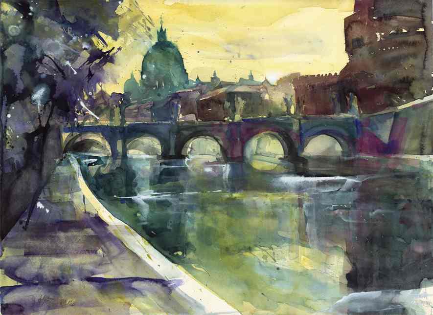 Die wichtigste Regel hierbei ist: Eine Spiegelung im Wasser ist in ihrem Farbauftrag nicht so kräftig wie das „Original“. Nehmen Sie daher mehr Wasser wenn Sie die Spiegelung andeuten. Nachdem man die Spiegelung erfasst hat, kann man das Wasser weiter farbig ausarbeiten. Dabei kann man leicht mit viel Wasser über die zuvor eingezeichnete Spiegelung malen, damit man sieht, dass sie sich im Wasser befindet. Achten Sie nur beim Malen darauf, dass die Spiegelung schon getrocknet ist, damit kein falscher Farbverlauf zustande kommt. Im letzten Schritt kann man nun einzelne Details und Schattierungen sowohl des Wassers, als auch der Spiegelung einzeichnen. Die Linienführung und die Umrisse im Wasser, sollten nur nicht so genau werden wie das „Original“, damit sie sich noch von diesem unterscheiden lassen.