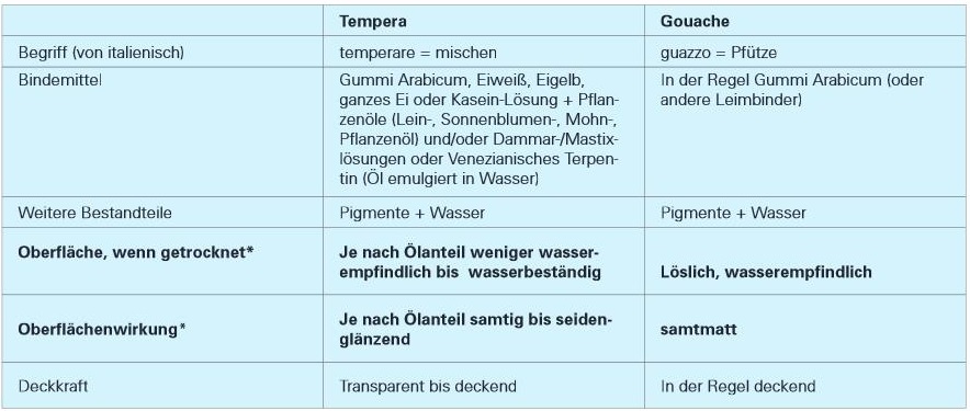 Die Temperafarbe ist, ähnlich wie die Gouachefarbe, gut deckend und wasserbasierend. Die Farbpigmente werden hierbei allerdings nicht mit Weißpartikeln vermischt, sondern mit verschiedenen Bindemitteln versetzt.