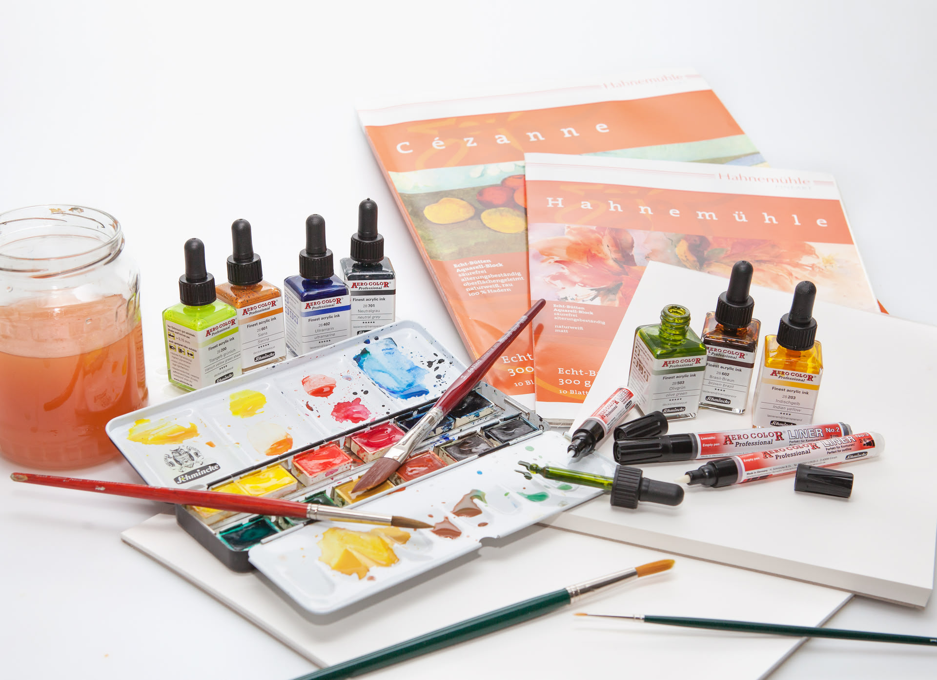 Um die Erkrather Telefonzelle in einen ausdrucksstarken Urban Sketch zu verwandeln, verwenden wir nur qualitativ hochwertiges Material. Dazu zählen in erster Linie die AERO COLOR® Professional Produkte von Schmincke. Das sind unsere Materialien im Detail: