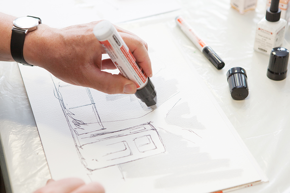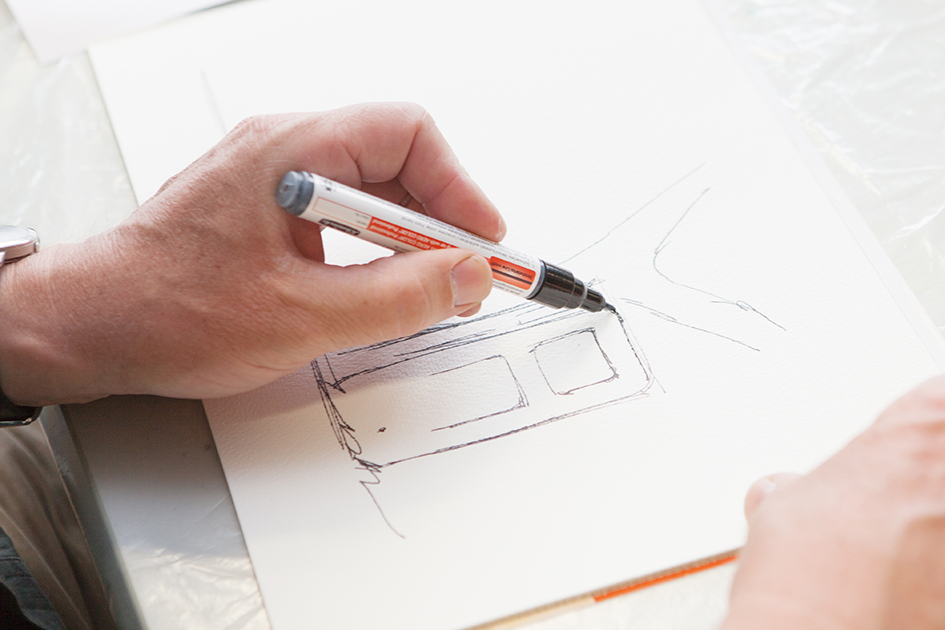 Wir beginnen ganz klassisch mit der Vorzeichnung. Dafür füllen Sie den AERO COLOR® Professional LINER Nr. 2 mit schwarzer AERO COLOR® Professional und zeichnen die Grundlinien der Telefonzelle.