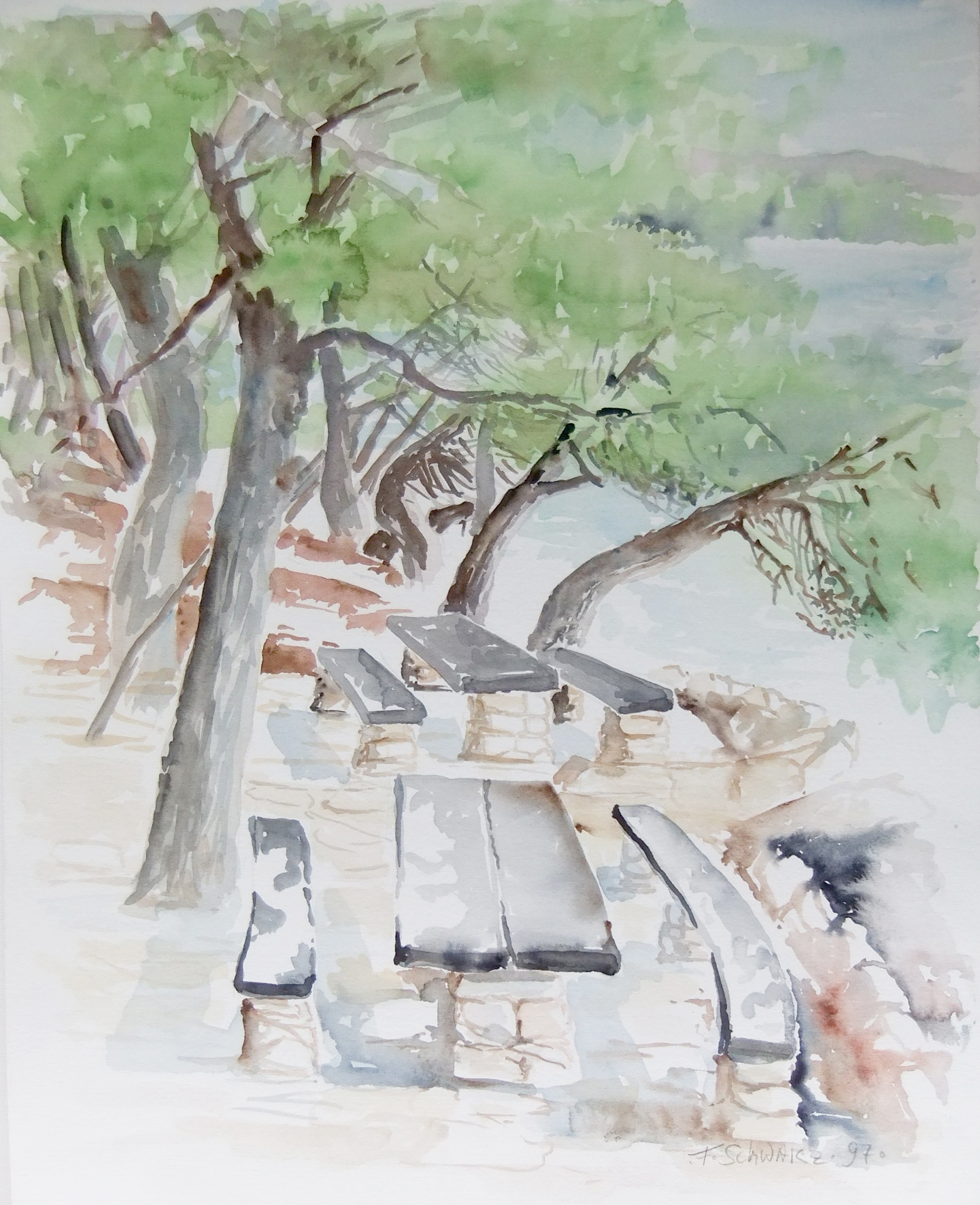 Möchte man beim Malen mit Aquarellfarben mal eine etwas andere Struktur erzeugen, so kann man es durchaus einmal mit Wachs probieren. Hierzu reibt man vorsichtig mit der Seite einer Wachskerze über das Aquarellpapier. Durch die Rauheit des Papiers haftet das Wachs nur Stellenweise auf dem Papier. Dies erzeugt später die Struktur. Eine strukturreiche Baumrinde profitiert z.B. von derartigen „Wachstricks“. Malt man nämlich später mit Farbe über diese Stellen, haftet die Farbe dort wo Wachs ist nicht mehr so gut und der Farbauftrag wird an den Stellen heller oder sogar unterbrochen.