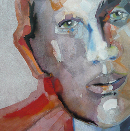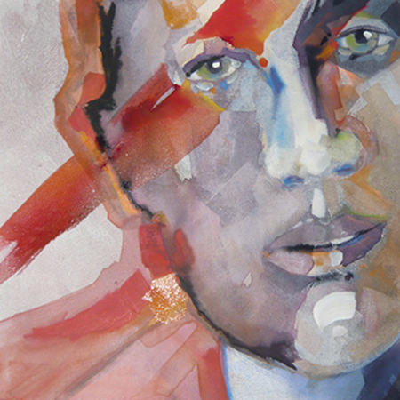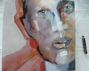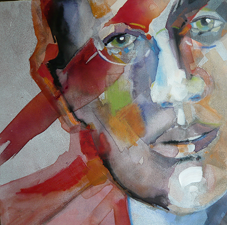 Nun intensiviert Ihr den Schatten neben der Nase in Violett. Für den Klecks auf der Wange greift Ihr nun den grünen Farbton auf, der noch von den Augen auf dem Acrylgemälde durchschimmert (Mischung aus HORADAM® Kadmiumorange und Heliocoelin). Daneben könnt Ihr noch ein bisschen Orange setzen. Um das fertige Gemälde zu schützen, solltet Ihr es mit (sobald es getrocknet ist) mit Aquarell-Fixativ überziehen. Sonst bleibt das neue Aquarell anlös- bzw. abwaschbar. Dafür könnt Ihr das Schmincke Aquarell-Fixativ AEROSPRAY nehmen. Sprüht mit einem Abstand von 30 cm von oben nach unten und von links nach rechts.