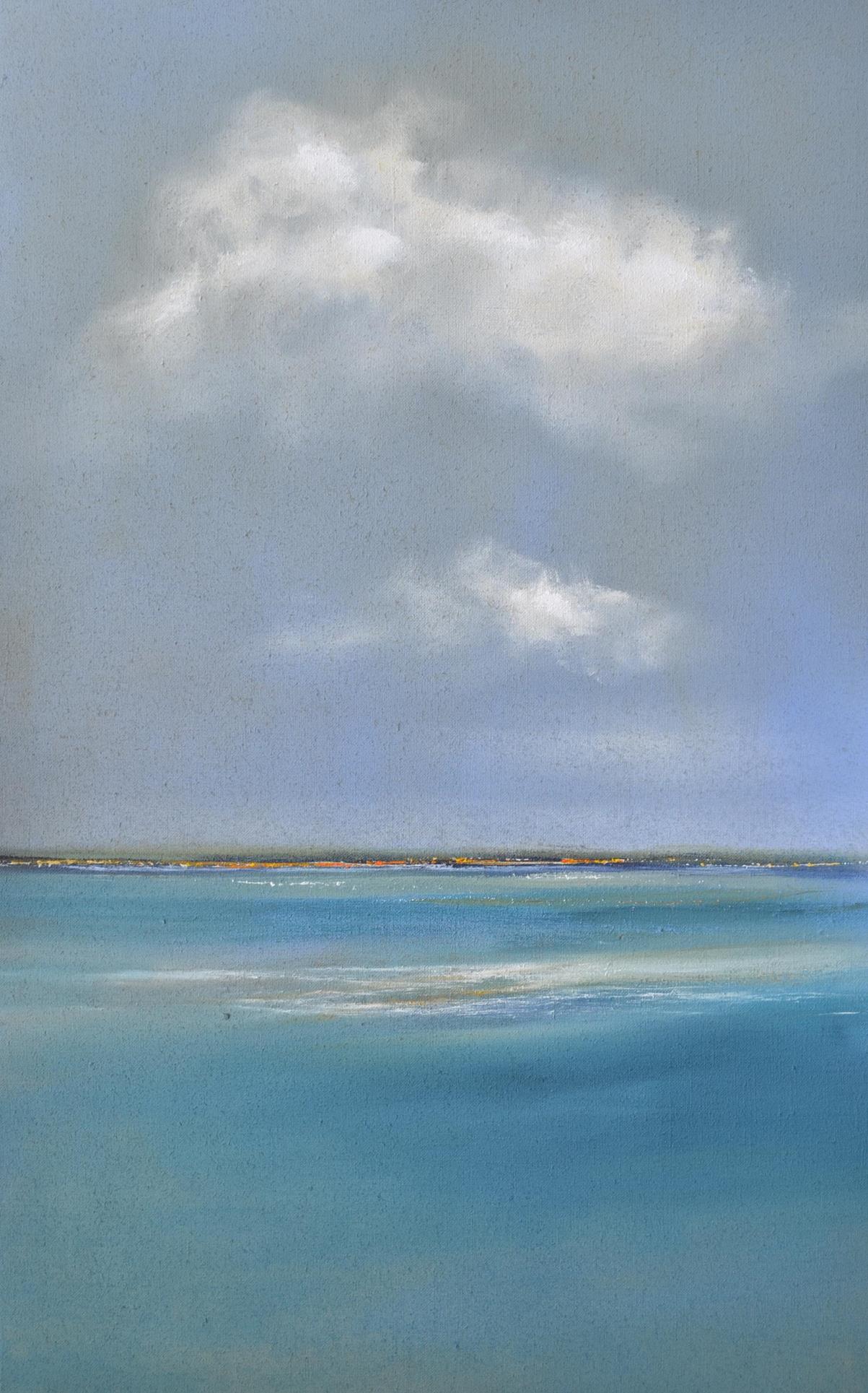 Ein schwieriger Punkt in realistischer Landschaftsmalerei ist die Darstellung von Wolken: leicht und schwebend müssen sie sein, zugleich ein dreidimensionales Volumen haben und „fluffig“, beweglich, fließend erscheinen. Oft wollen sie nach oben über den Bildrand entschweben oder nach unten abstürzen, wie Beton im Himmel hängen oder allzu zaghaft verwehen. Tipp: wenig Farbmasse nehmen, diese dünnflüssig in vielen Schichten in hell auf dunkel auftragen mit weichen Arbeitsmitteln wie: Vergolderfächerpinsel, weicher Rundpinsel, Schwamm, langhaariger weicher Borstenpinsel