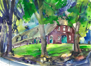 • Auf dem Aquarellbild von Jutta Höfs wird das Rathaus in Worpswede dargestellt.