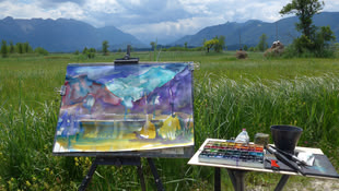 • Bei dem Bild handelt es sich um eine Kursimpression von Jutta Höfs. Vor einer Wiese mit Blick auf die Berge ist eine Staffelei aufgebaut.