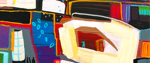 • Werk von Bettina Bülow-Böll, das eine Straßenszene aus der Vogelperspektive veranschaulicht.