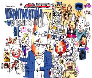 • Auf dem Werk von Felix Scheinberger befinden sich verschiedene Figuren. Links oben befindet sich ein Schriftzug: “Verantwortung- wer übernimmt sie?”