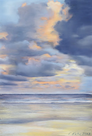• Eine Pastellmalerei von Karin Kuthe, in der eine Landschaft am Meer abgebildet wird.
