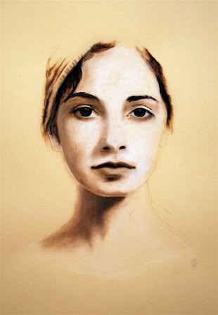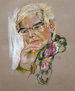 • Ein Werk der Pastelllmalerei von Brigitte Guhle, in der eine Frau porträtiert wird.