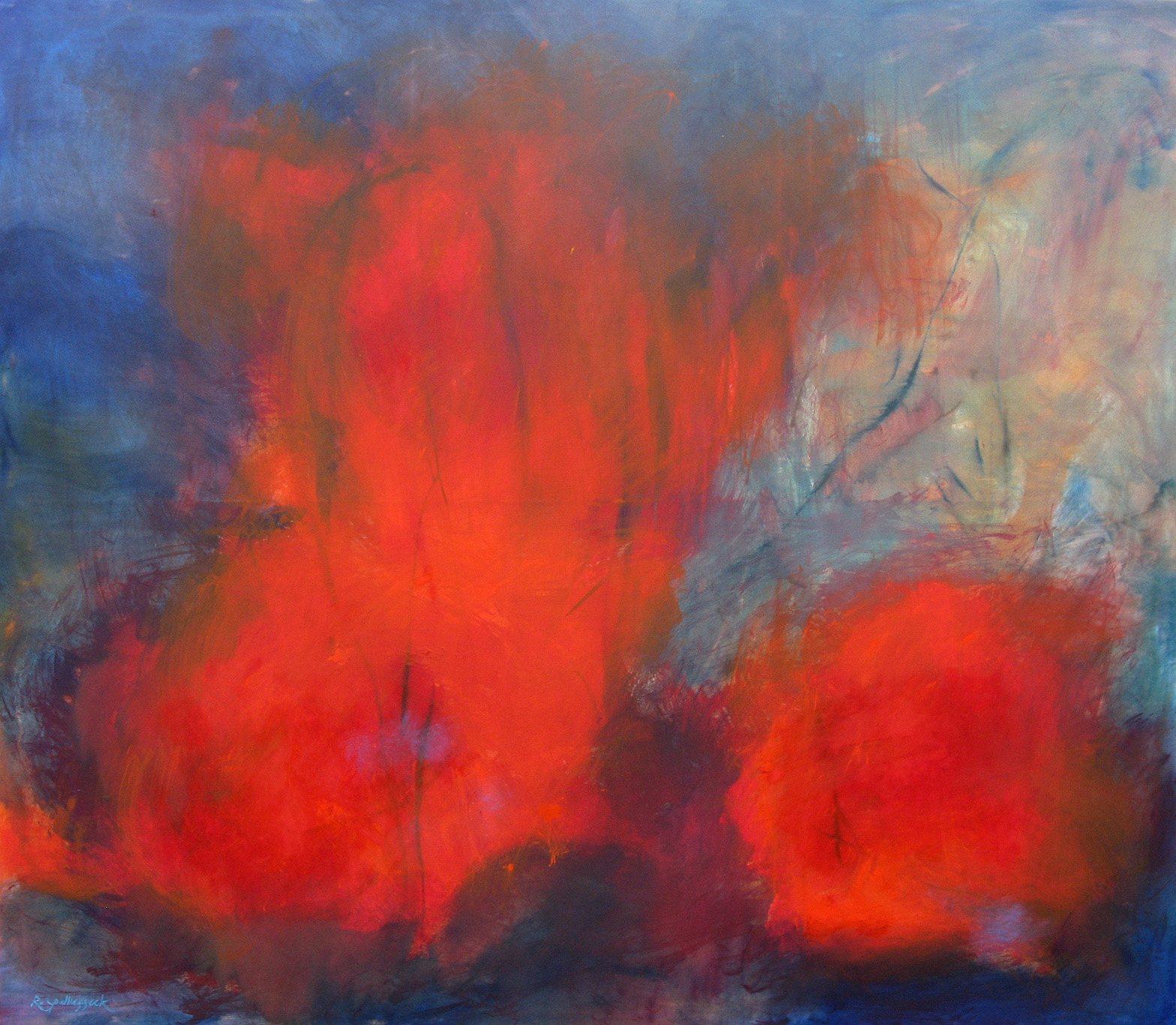 Normalerweise arbeitet man bei einem Impasto-Bild mit einer Untermalung aus komplementär-gebrochenen Farben und diese wird dann mit kräftigen bunten Farben akzentuiert bzw. stellenweise übermalt. Bei Rot funktioniert dieses „Ich-bringe-Leuchtkraft-in-die-Farbe“ nur bedingt, da rote Farbtöne zur Transparenz neigen. Man könnte meinen rote Stellen mit Weiß aufzumischen, doch dann erhält man nur ein Rosa.. Kleiner Tipp: Sparen Sie sich einfach die gebrochene Untermalung an den hellen Stellen und tragen das leuchtende Rot einfach direkt auf. So bleibt die Leuchtkraft an hellen Stellen erhalten.