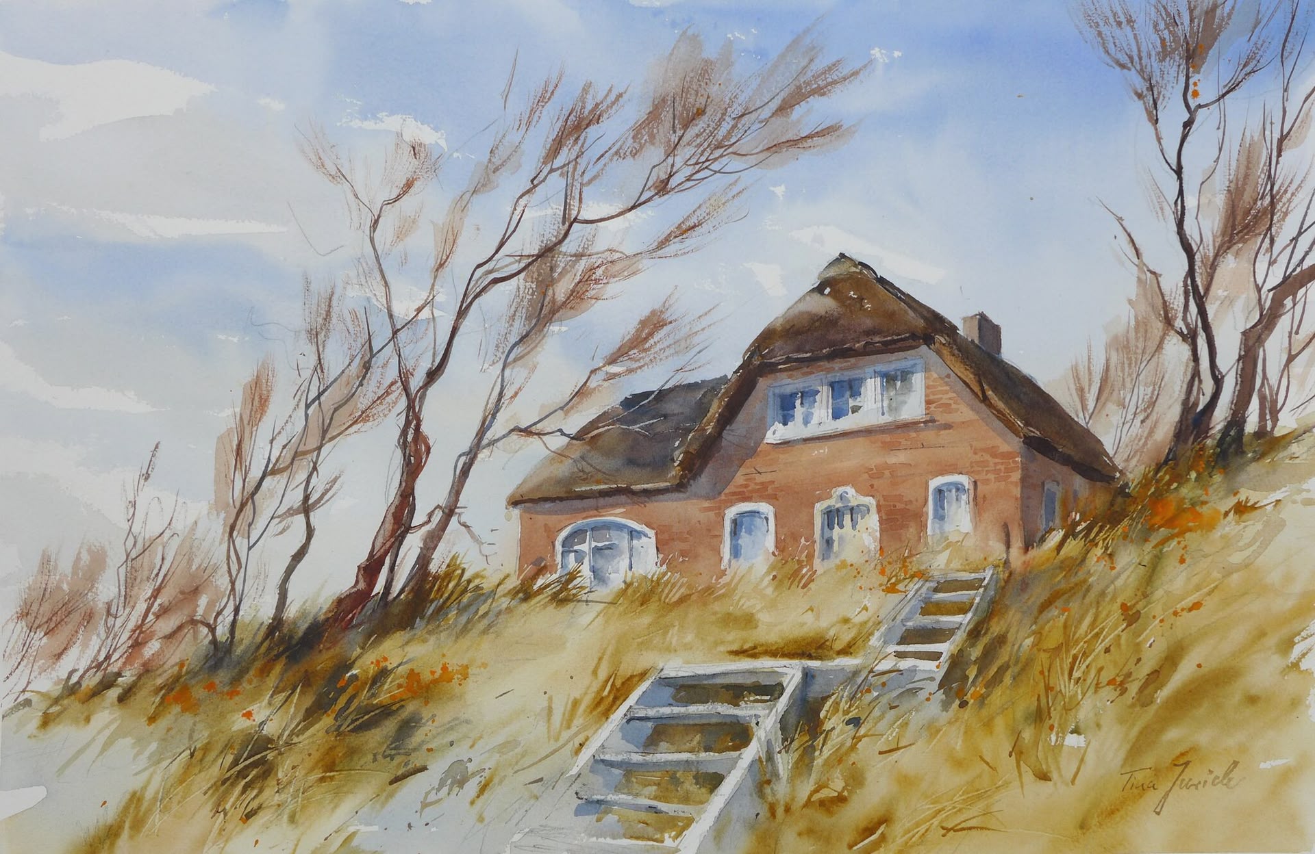 Die erste Regel beim Malen von Häusern und Gebäuden ist das Vereinfachen. Zu viele Details lenken vom eigentlichen, kompositionellen Wert des Gebäudes ab. Interessieren Sie sich für Skylines und Häuserumrisse, empfiehlt es sich immer mit Gegenlicht zu arbeiten, dann wirkt die Komposition direkt kontrastreicher. Zusätzlich sollte die Korrektheit der Perspektive genau überprüft werden. Nicht zuletzt, sollte man dann bei der farblichen Ausarbeitung noch darauf achten entweder in kühlen oder in warmen Farbtönen zu arbeiten, damit ein optischer Zusammenhalt im Bild entsteht.