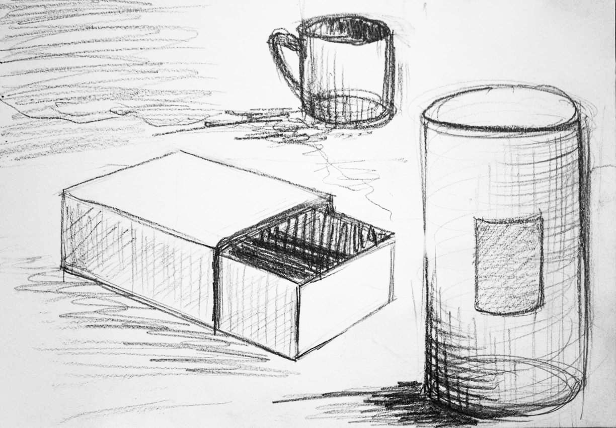 Als Zeichenneuling sollte man sich zunächst einfacheren Formen widmen. Es kann sich zum Beispiel um eine Dose oder eine Streichholzschachtel handeln. Wichtig: Zeichnen Sie groß und flächig damit ein weißer Rand Ihre kleine Zeichnung nicht erdrückt.
