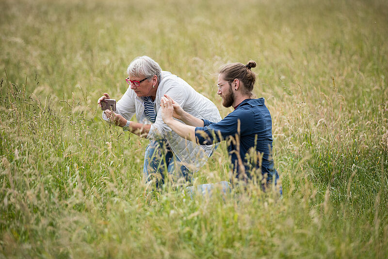 Auch die Praxis ist für mich zweigeteilt. Ich mache zuerst einen technisch-gestalterischen Praxisteil, das war ja schon am Samstag. Da werden dann einfach verschiedene Dinge aus der Theorie ausprobiert, zum Beispiel Perspektiven und Einstellungen. Da habe ich auch konkrete Aufgaben für die Teilnehmer.