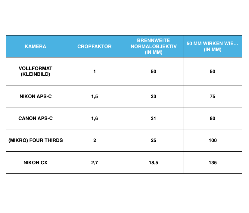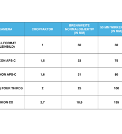 Wie groß der Bildwinkel eines bestimmten Objektivs ist, lässt sich normalerweise problemlos durch die verwendete Brennweite ermitteln. Ein wenig komplizierter wird es jedoch, sobald nicht mit Vollformatsensor (entsprechend dem Kleinbildformat 24 x 36 mm) fotografiert wird. Da bei kleineren Sensoren nur ein Teil des Bildwinkels verwendet wird, den ein Vollformatsensor nutzen würde, muss die Rechnung durch den sogenannten Cropfaktor angepasst werden. Die Brennweite des Vollformats muss also durch den Cropfaktor geteilt werden, um diejenige Brennweite zu erhalten, die den gleichen Bildwinkel wie beim Kleinbildformat erreicht.