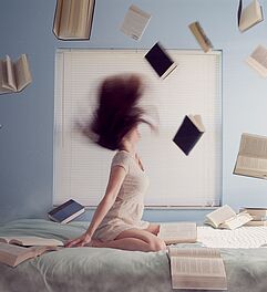 • Eine Frau sitzt auf einem Bett, um sie herum fliegen Bücher