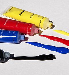 Auch wenn nun schnell die Idee aufkommt, die Farbe zur Verflüssigung einfach mit Wasser zu mischen, funktioniert dieser Trick hier leider nicht wie gewünscht. Wenn Leitungswasser als das einzige Verdünnungsmittel verwendet wird, kann es die Struktur der Acrylfarbe zerstören. Eine zu große Menge an Wasser führt dazu, dass das Verhältnis von Binde- und Lösungsmittel sein Gleichgewicht verliert. Dies bewirkt eine ungleichmäßige Verteilung der Pigmente, sodass der Farbfilm Risse bekommt. Für absolute Pouring-Anfänger empfiehlt es sich trotzdem, bei den ersten Versuchen nur Wasser als Verdünnungsmittel für die Acrylarbe zu verwenden. Beim ersten Ausprobieren können Sie so testen, ob das Pouring Ihnen liegt und vor allem auch, ob es Ihnen Spaß bereitet. Wenn beides auf Sie zutrifft, sind Sie bereit für den nächsten Schritt! Mehr dazu lesen Sie im anschließenden Tipp.