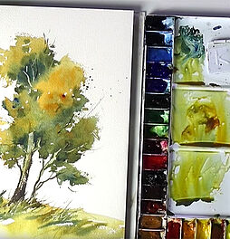 Ein kleiner Tipp um verschiedene Grüntöne zu mischen ist es Phthalogrün mit Siena gebrannt zu mischen. Je nachdem wie viel Siena gebrannt man in das Phthalogrün mischt ist das grün greller oder matter. Um den ermischten Farbton anschließend noch etwas aufzuhellen, gibt man noch etwas Reingelb hinzu. So ergeben sich zahlreiche Grüntöne.