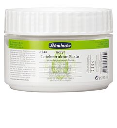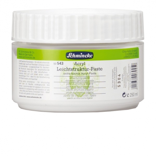 Die Schmincke Leichtstruktur-Paste enthält Titanweißpigmente und trocknet daher deckend auf, was für eine Leichtstruktur-Paste normalerweise nicht verständlich ist. Ist sie einmal getrocknet, besitzt sie eine mittelharte Konsistenz, die sich vielfältig übermalen und weiterverarbeiten lässt.