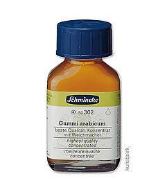 Der Kenner fragt sich sicher, was diese Kombination soll, da Gouchachefarben bereits das Bindemittel Gummi Arabicum enthalten. Das akazienharzhaltige Bindemittel hat die Eigenschaft die Konsistenz der Gouchefarbe zu verändern. Je mehr Gummi Arabicum man der Gouachefarbe hinzufügt, desto gelartiger wird die Farbe. Dabei wird sie meist ein wenig transparenter, sodass beim Malen Pinselspuren sichtbar werden.