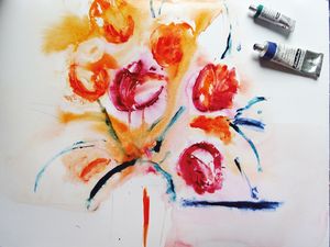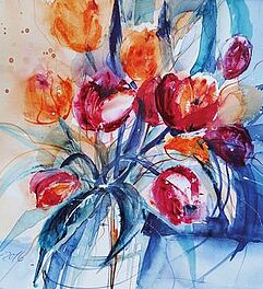 Jetzt nehmt Ihr einen dünnen Pinsel und bringt ein paar Details ins Bild. Dazu gehören Konturen und feine Linien, um das Bild zu beleben und ihm gleichzeitig eine festere Struktur zu verleihen. Mit AERO COLOR® Professional SUPRA-Weiß spritzt Ihr die weißen Lichtpunkte auf das Bild und zeichnet weitere feine Linien mit einem dünnen Pinsel ein. Letzte Farbspritzer in den Blumenfarben vollenden das abstrahierte und frische Blumenaquarell. Die Spritzer werden mit verdünnter Aquarell-Farbe und einem großen Aquarellpinsel aufgetragen, der leicht über dem Motiv ausgeschlagen wird.