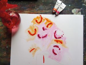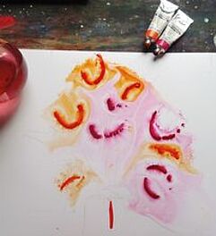 Jetzt nehmt Ihr die Wassersprühflasche und benetzt die Farbe vorsichtig, sodass sich die Aquarellfarben spontan vermischen können und dabei großflächig ineinanderlaufen. Beim Vermischen blühen die Farben aus, sie bekommen also unregelmäßige Ränder. Als nächstes verteilt Ihr die Farbe mit dem Malmesser innerhalb der Blütenformen, damit die Blütenflächen weiter mit Farbe gefüllt werden und die Formen erkennbar werden. Wechselt wässrige Verläufe mit kräftigen Farben ab, sodass Ihr den Blüten Leichtigkeit und Leben verleiht.