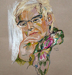• Foto von einem gezeichneten Portrait und einer Hand, die einen Bleistift darüber hält