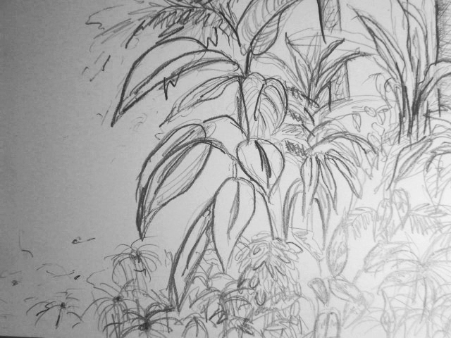 Zum Zeichnen von Pflanzen und Blättern hilft es zunächst die äußere Form zu vereinfachen. Dies hilft für die weitere Orientierung. Später lassen sich so leichter die konkreten Details herausarbeiten.