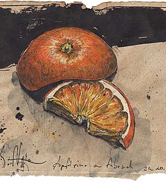 • Eine Farbtube auf einem orangenen Hintergrund.