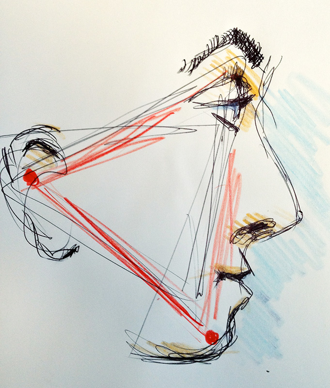 Beim Ermitteln des richtigen Platzes für ein Ohr kann man sich mit einem gleichseitigen Dreieck behelfen, das sich vom Kinn übers Auge bis zum Ohr zieht.