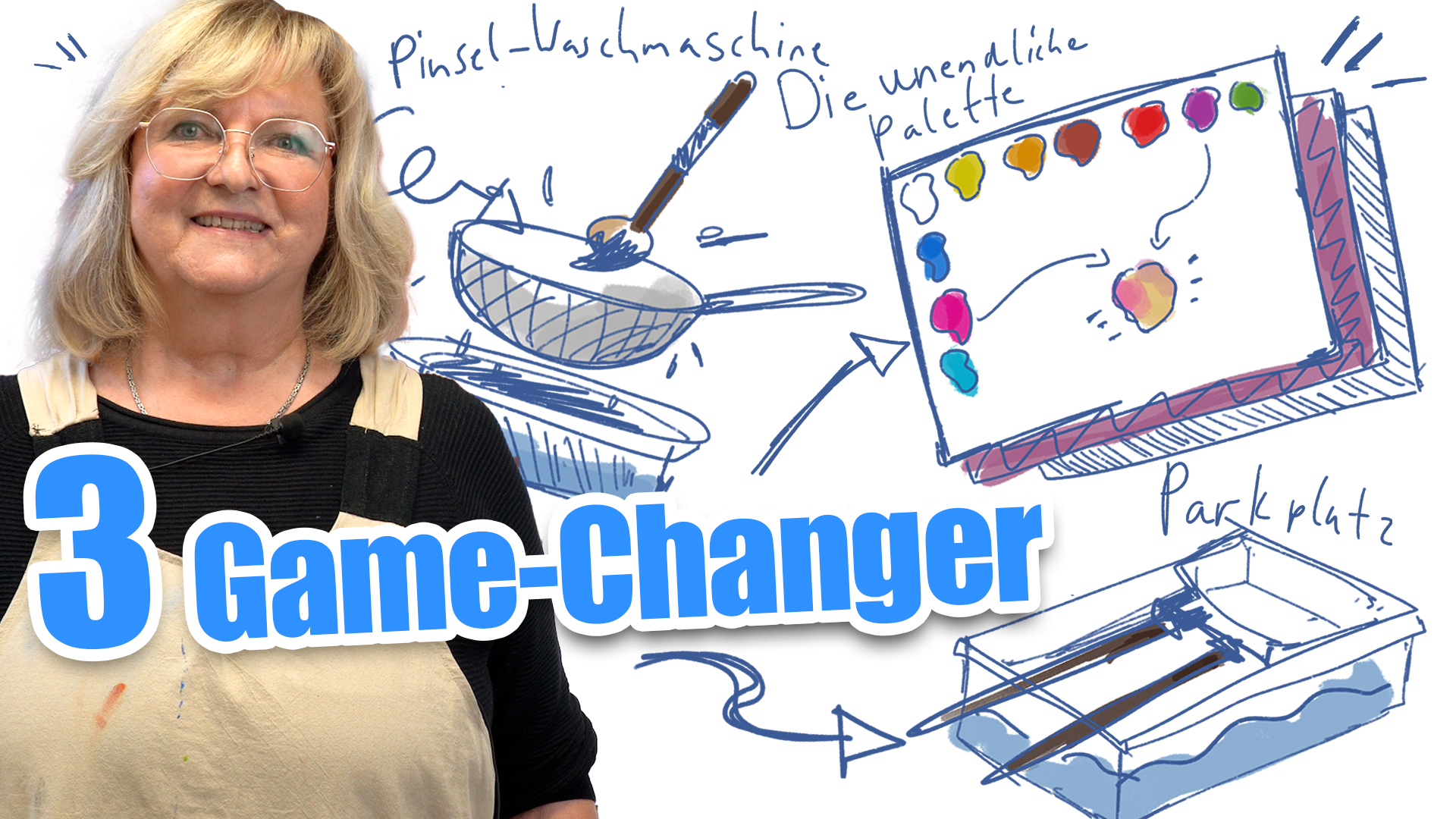 • Links Bild einer Frau mit einer Malschürze, rechts daneben sind digitale Zeichnungen von Pinseln, darüber liegt eine Überschrift mit dem Titel "3 Game-Changer"